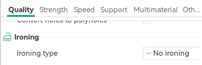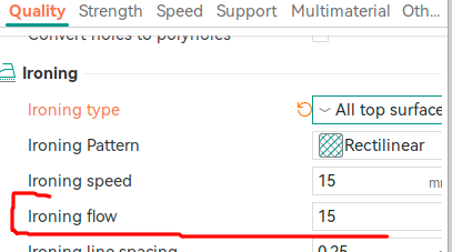 Salutation ! Je n'utilise pas Bambu Studio, mais je vais illustrer avec des captures d'Orca Slicer qui lui ressemble beaucoup, il me semble… "Repassage" (fr) alias "Ironing" (en), activé ? (Paramètre visible seulement si "Advanced" coché ( ) ) si oui, alors, soit le désactiver pour voir si c'est mieux sans. ou ajuster le "débit du repassage" alias "Ironing flow" … qui dans le cas de cette impression doit être insuffisant (mais à vérifier par des essais ) Mais je dirais avant de changer cela, de vérifier le "débit" / "Flow rate" dans le profil filament utilisé pour cette impression avec cette bobine de filament. ( Faire des essais de calibration du "Flow rate" selon la bobine utilisée ... ) Car, un débit inadapté pour une bobine de filament, pourrait être la raison du second problème ( Les couches pleines sont plus larges que les couche ayant une partie avec un remplissage différent de 100%. En gros, si le débit n'est pas parfaitement ajusté pour la bobine, cela impacte les murs de la coque qui sont si en sous-extrusion un poil décalé vers l'intérieur quand ce n'est pas une couche remplie à 100%, ou décalé à l'extérieur si tu te trouves en sur-extrusion. )