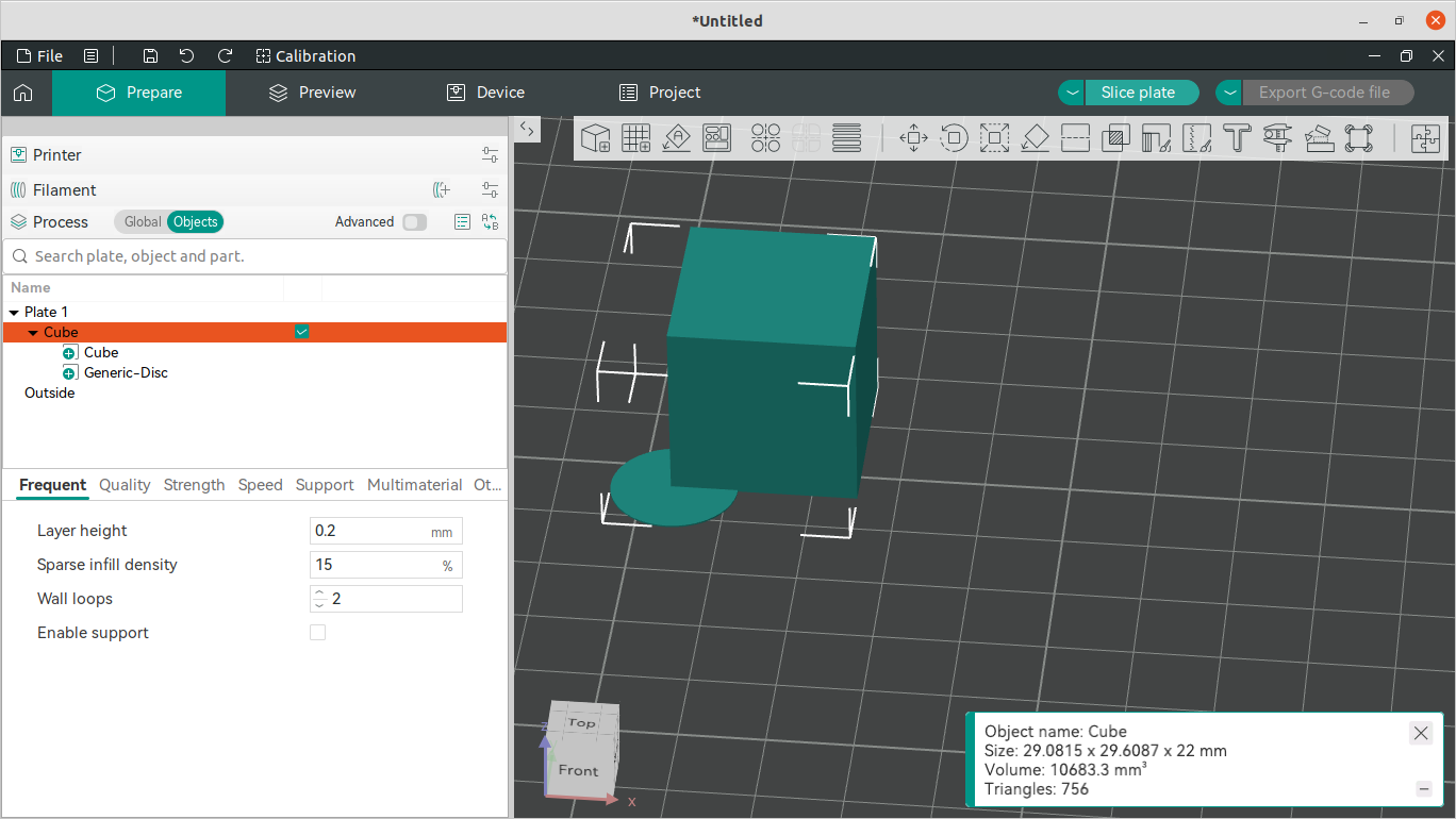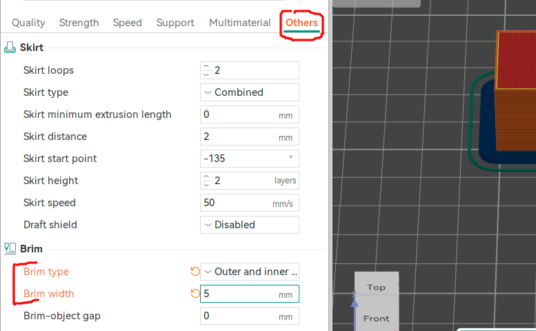 Salutations Je dirais d'utiliser une bordure d'impression (brim) de disons 5-7 mm de largeur, plutot/en plus, d'une jupe (skirt) Si cela ne suffit pas, ajouter des tabs/discs à l'objet. via un clic droit sur l'objet pour avoir le menu contextuel où l'on sélectionne "Add Part" -> "Disc" et le déplacer sur un des coins. ( Bien remarquer qu'il faut préférer un "Add Part" sinon si tu utilises une "Add Primitive" -> "Disc", il te faudra les grouper/assembler, sinon le trancheur te fera un message d'avertissement lors du découpage car il donnera un résultat incohérent...)