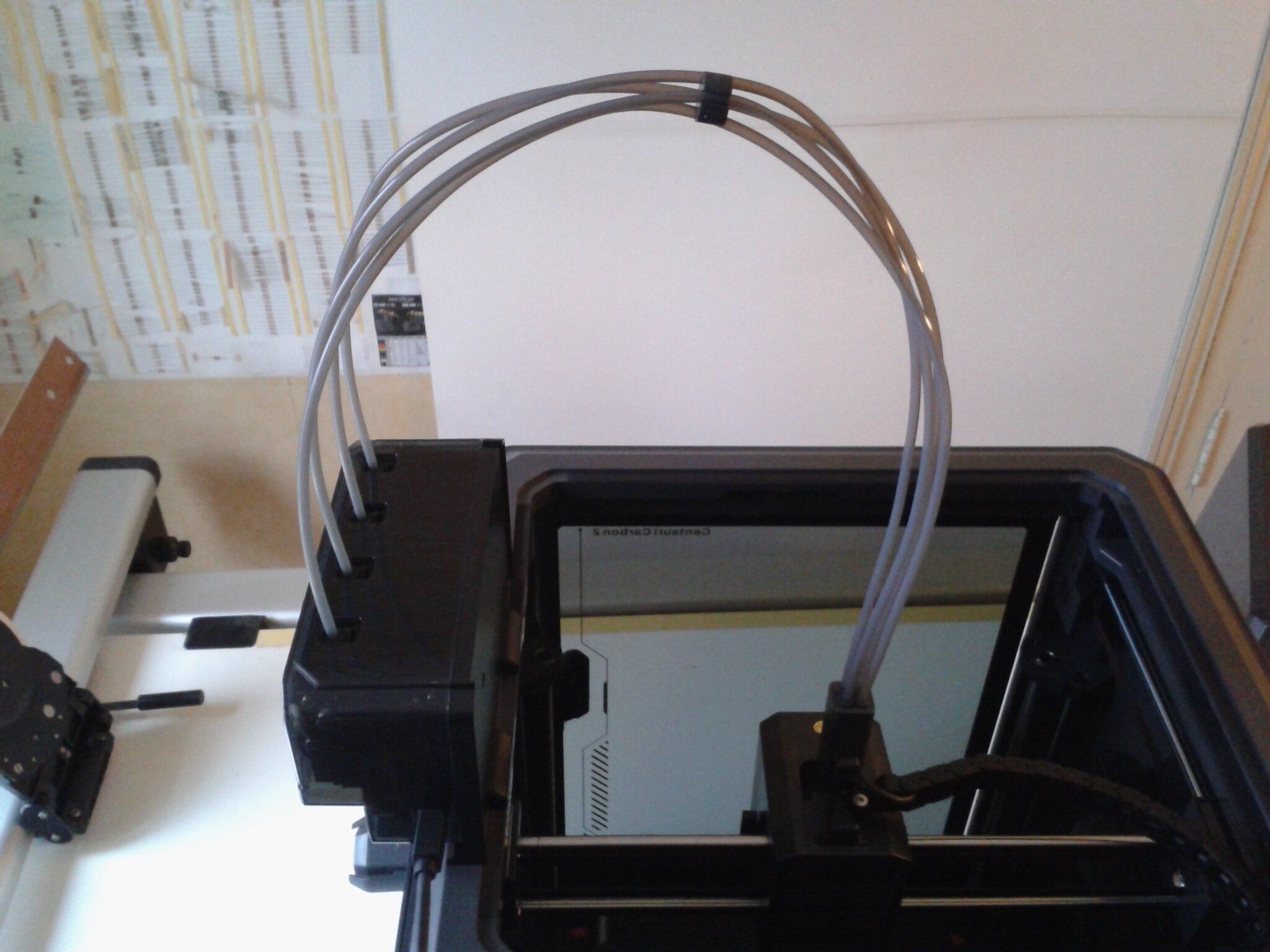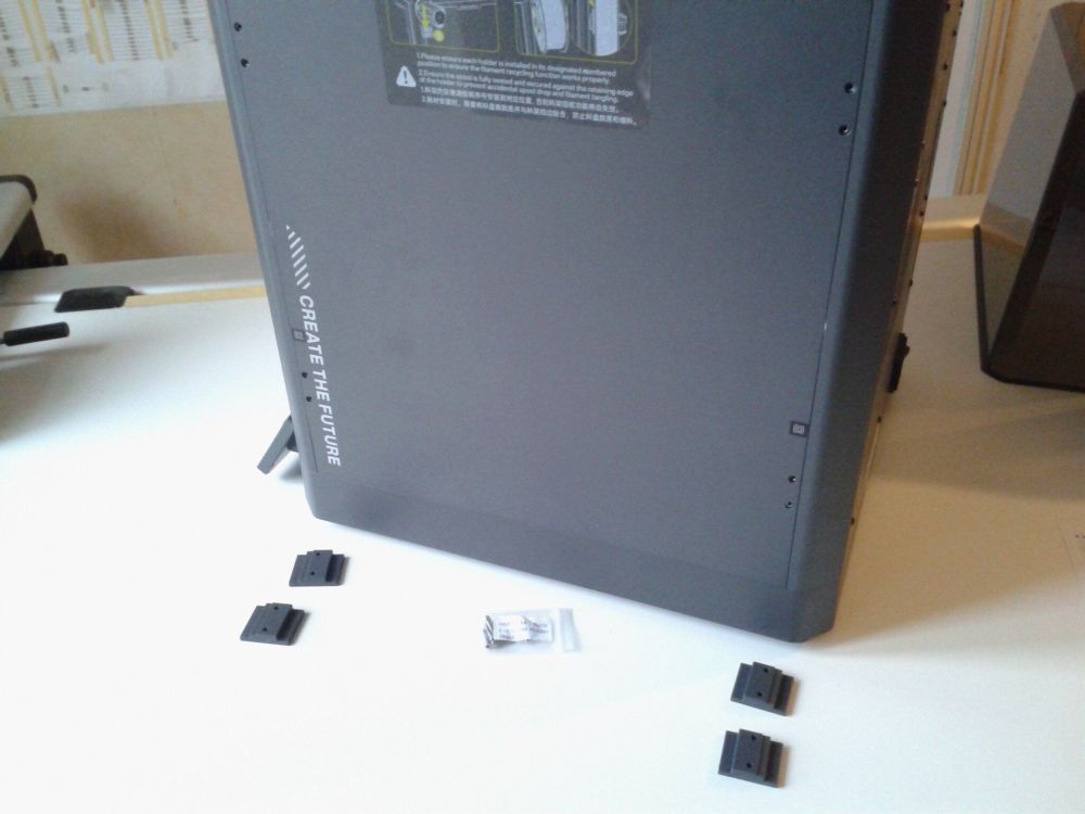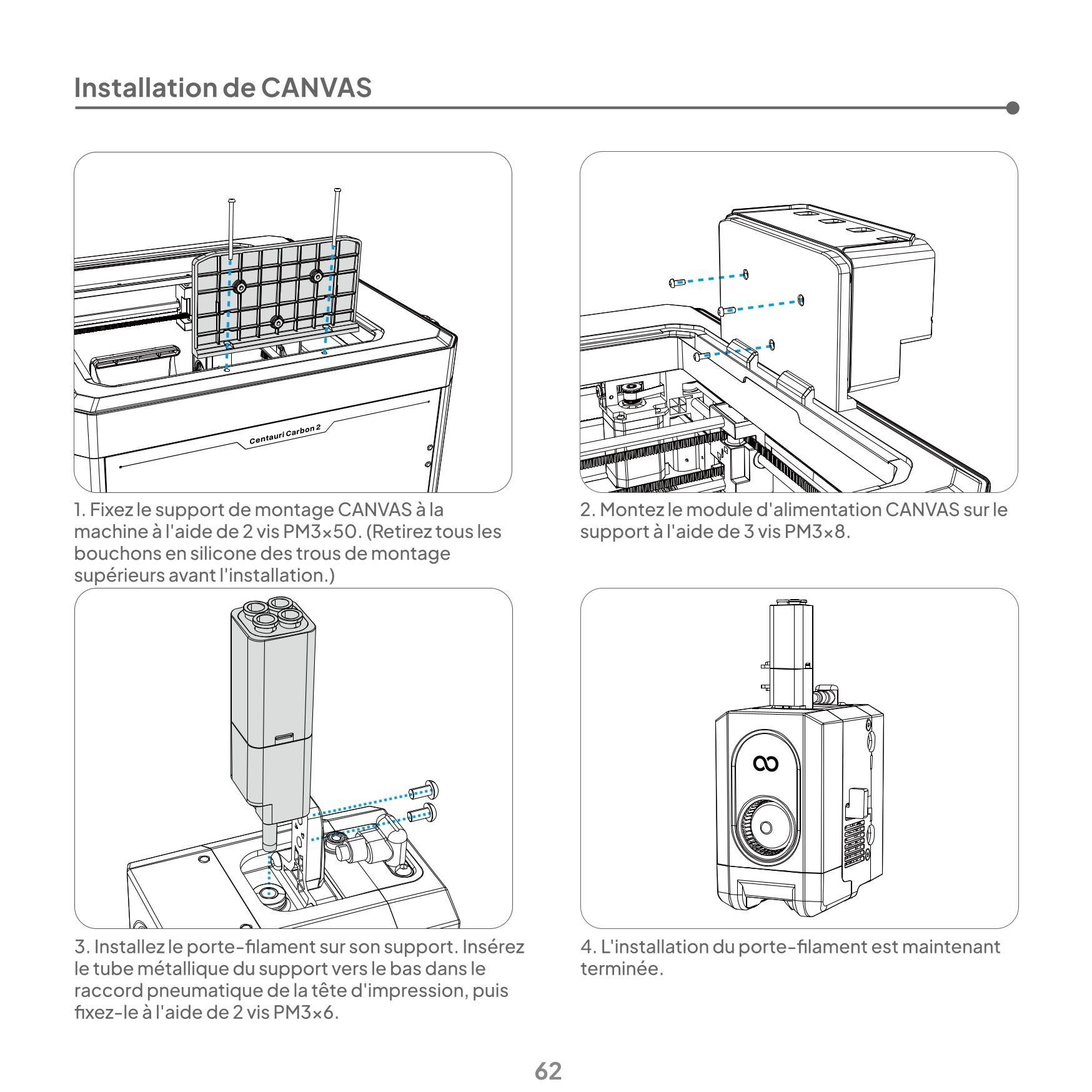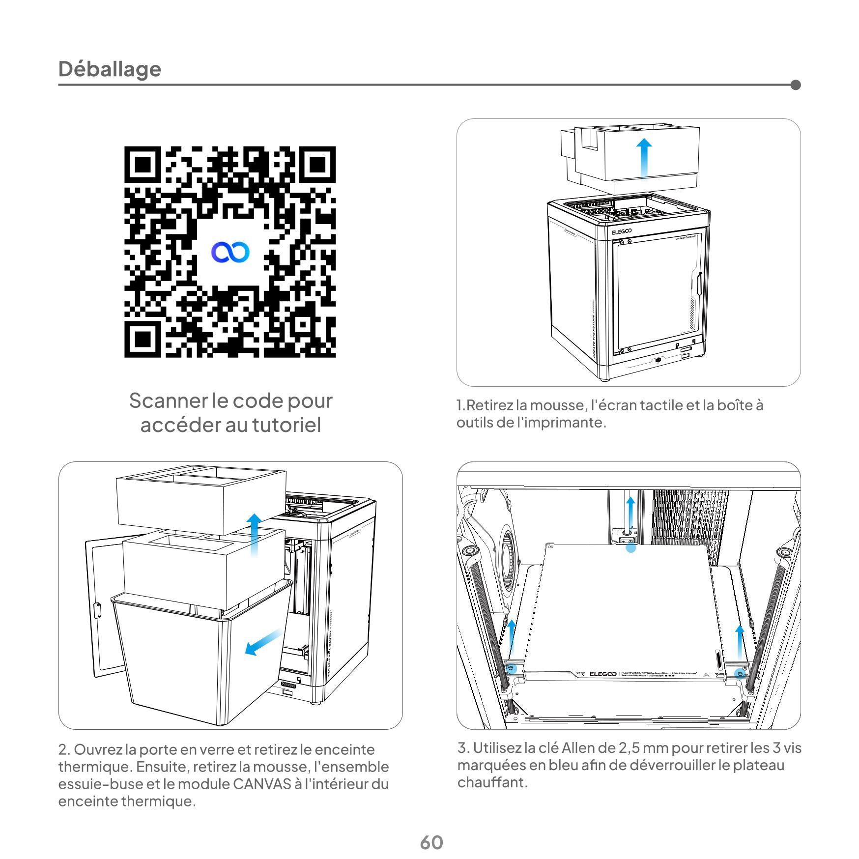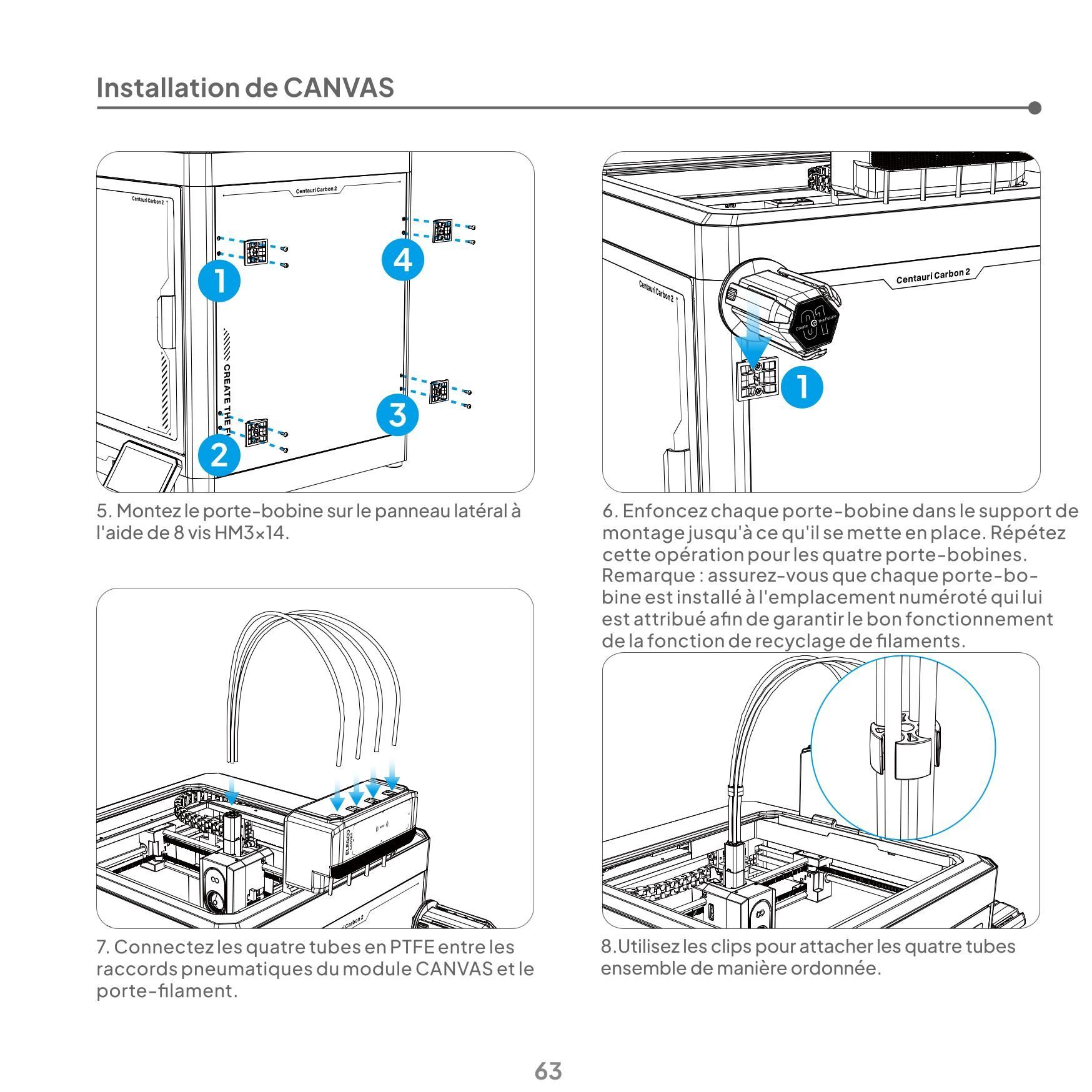 Assemblage C'est relativement simple et prend une dizaine de minutes, tout est détaillé dans la documentation papier fournie. Si pas déjà fait lors du déballage, il faut retirer les trois vis qui sécurisent le plateau lors du transport. Puis Connecter et mettre en place l'écran. Placer et fixer avec quatre vis l'ensemble essuie-buse ("nozzle wiper assembly"). ( On peut ici vérifier que si on déplace manuellement la tête d'impression face puis vers le système essuie-buse que le nez de la buse se trouve bien un poil au-dessus de la partie en métal et que cette partie en métal se déplace d'arrière en avant quand on en rapproche la tête. Tête en face de la partie en métal de la chute du système essuie-buse. Tête poussée contre le système essuie-buse, la partie en métal s'avance avec la poussée de la tête contre le système essuie-buse. ) Installer le support pour le système CANVAS au châssis avec deux vis, Fixer le système CANVAS a son support avec trois vis, insérer le hub-filament (4 entrées, 1 sortie) à l'entrée de la tête d'impression et le fixer avec deux vis, Fixer les quatre supports des porte-bobines mettre en place les portes-bobines (attention bien respecter la numérotation car deux porte-bobines ont un ressort qui tourne à gauche et les deux autres tournent à droite et donc si vous inversez le 1 ou 2 avec le 3 ou 4 cela ne maintiendra plus les filaments légèrement tendus sur les bobines et il y aura risque de nœuds du filament sur ces bobines lors des changements de filaments) Connecter le câble 4 broches du système CANVAS Connecter entre le système CANVAS et le hub filament les 4 tubes PTFE de guidage du filament Remarquer que quand l'on pousse les tubes PTFE dans le hub, une partie du hub est sur ressort. Si vous avez un jour besoin de déconnecter un tube PTFE du hub-filament, il vous faudra un l'outil "PTFE Tube Tool" (fichier d'impression de cet outil dans la mémoire de l'imprimante et fourni sur la clé USB) pour faire cet appui qui pousse cette partie du hub sur ressort pour déverrouiller le système qui bloque les bouts de tube PTFE dans le hub. Assembler les deux parties du couvercle de l'enceinte thermique en calant et glissant la petite partie, et placer l'ensemble sur la machine. Retirer la petite étiquette papier de la plaque flexible et replacer la plaque. Vérifier le filtre derrière la grille