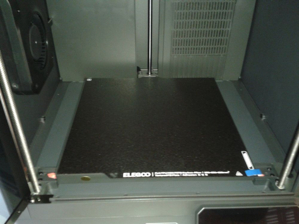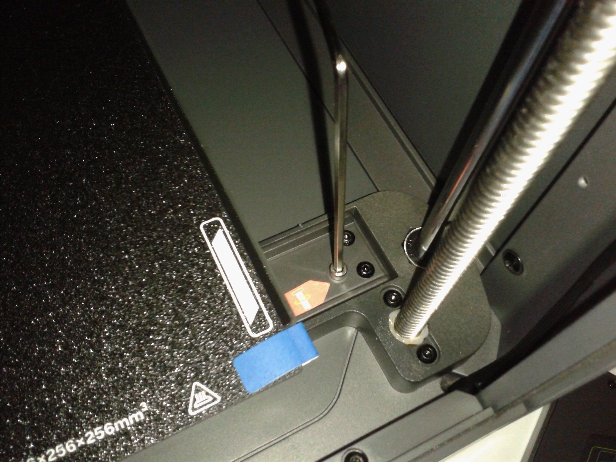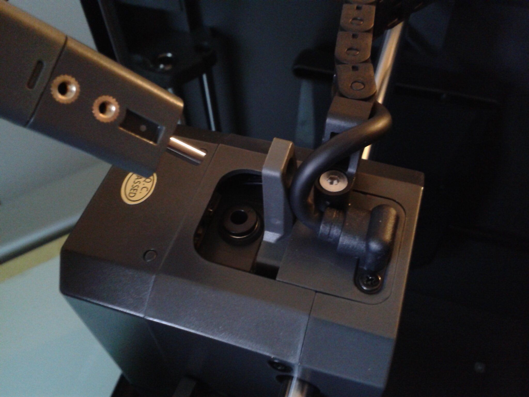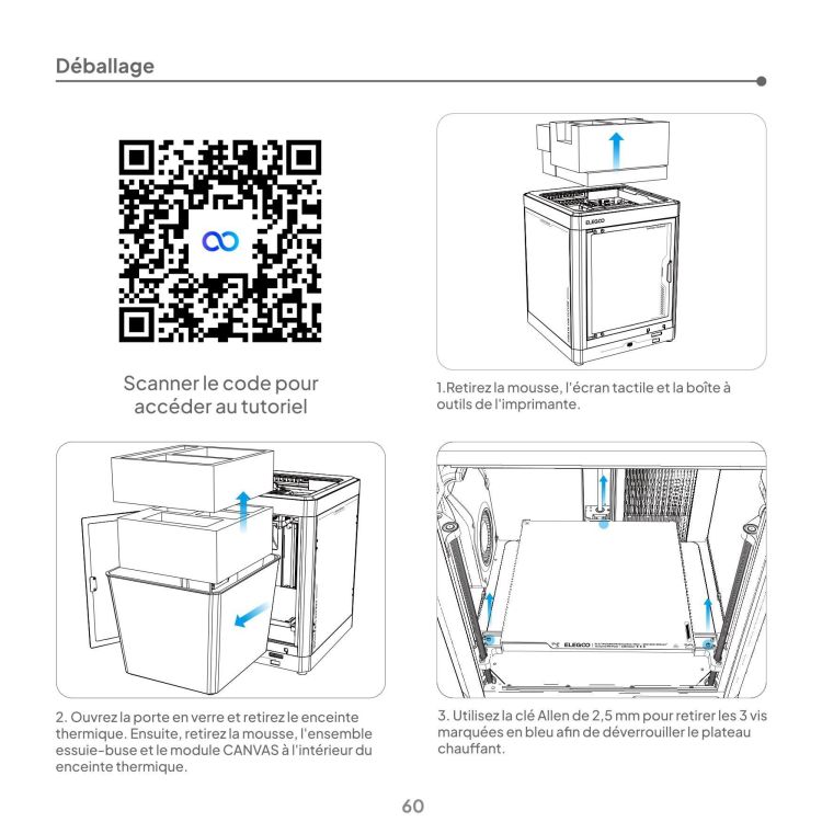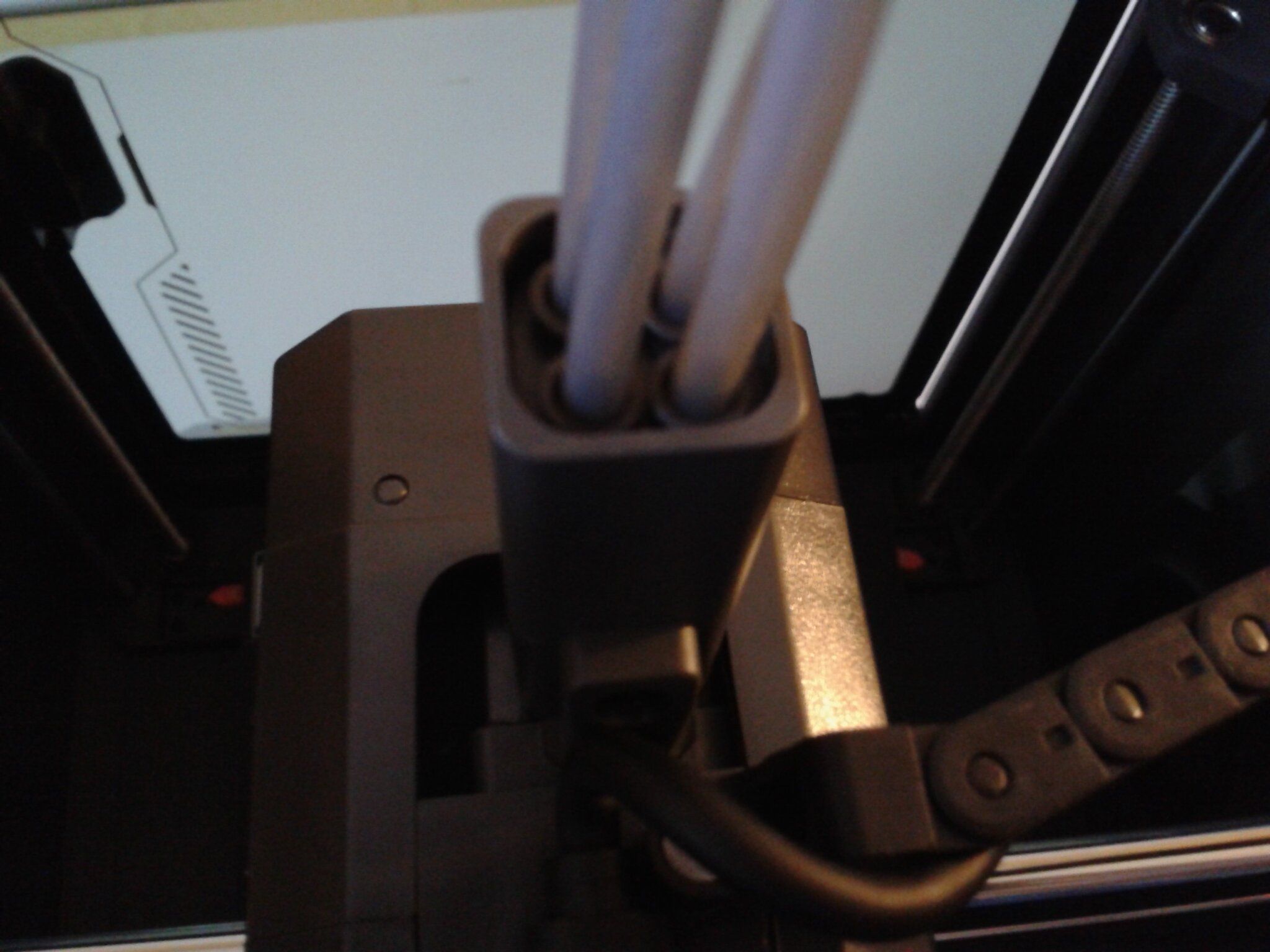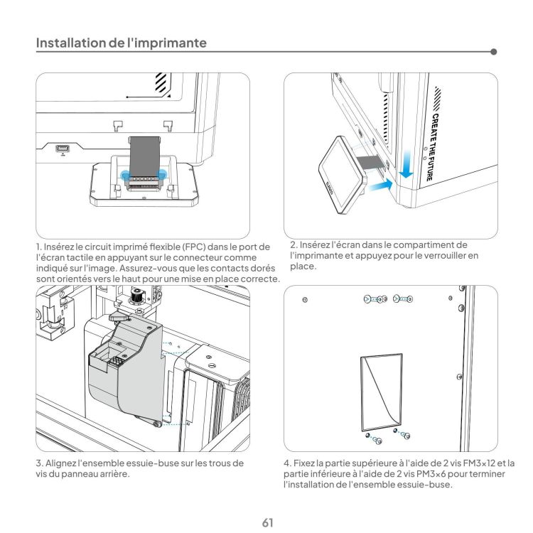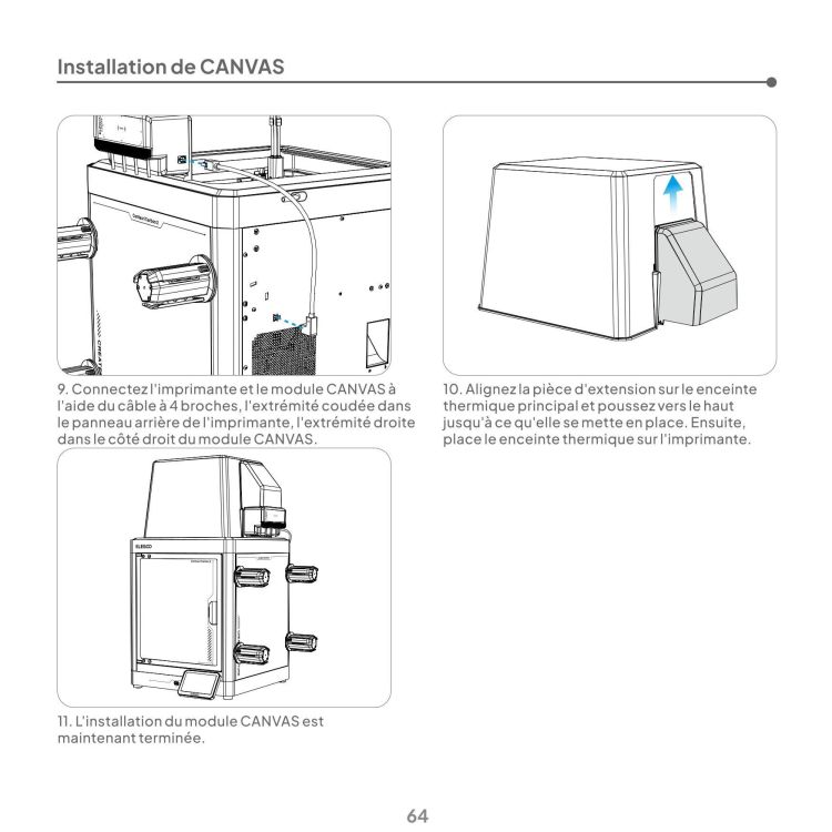 Assemblage C'est relativement simple et prend une dizaine de minutes, tout est détaillé dans la documentation papier fournie. Si pas déjà fait lors du déballage, il faut retirer les trois vis qui sécurisent le plateau lors du transport. Puis Connecter et mettre en place l'écran. Placer et fixer avec quatre vis l'ensemble essuie-buse ("nozzle wiper assembly"). ( On peut ici vérifier que si on déplace manuellement la tête d'impression face puis vers le système essuie-buse que le nez de la buse se trouve bien un poil au-dessus de la partie en métal et que cette partie en métal se déplace d'arrière en avant quand on en rapproche la tête. Tête en face de la partie en métal de la chute du système essuie-buse. Tête poussée contre le système essuie-buse, la partie en métal s'avance avec la poussée de la tête contre le système essuie-buse. ) Installer le support pour le système CANVAS au châssis avec deux vis, Fixer le système CANVAS a son support avec trois vis, insérer le hub-filament (4 entrées, 1 sortie) à l'entrée de la tête d'impression et le fixer avec deux vis, Fixer les quatre supports des porte-bobines mettre en place les portes-bobines (attention bien respecter la numérotation car deux porte-bobines ont un ressort qui tourne à gauche et les deux autres tournent à droite et donc si vous inversez le 1 ou 2 avec le 3 ou 4 cela ne maintiendra plus les filaments légèrement tendus sur les bobines et il y aura risque de nœuds du filament sur ces bobines lors des changements de filaments) Connecter le câble 4 broches du système CANVAS Connecter entre le système CANVAS et le hub filament les 4 tubes PTFE de guidage du filament Remarquer que quand l'on pousse les tubes PTFE dans le hub, une partie du hub est sur ressort. Si vous avez un jour besoin de déconnecter un tube PTFE du hub-filament, il vous faudra un l'outil "PTFE Tube Tool" (fichier d'impression de cet outil dans la mémoire de l'imprimante et fourni sur la clé USB) pour faire cet appui qui pousse cette partie du hub sur ressort pour déverrouiller le système qui bloque les bouts de tube PTFE dans le hub. Assembler les deux parties du couvercle de l'enceinte thermique en calant et glissant la petite partie, et placer l'ensemble sur la machine. Retirer la petite étiquette papier de la plaque flexible et replacer la plaque. Vérifier le filtre derrière la grille