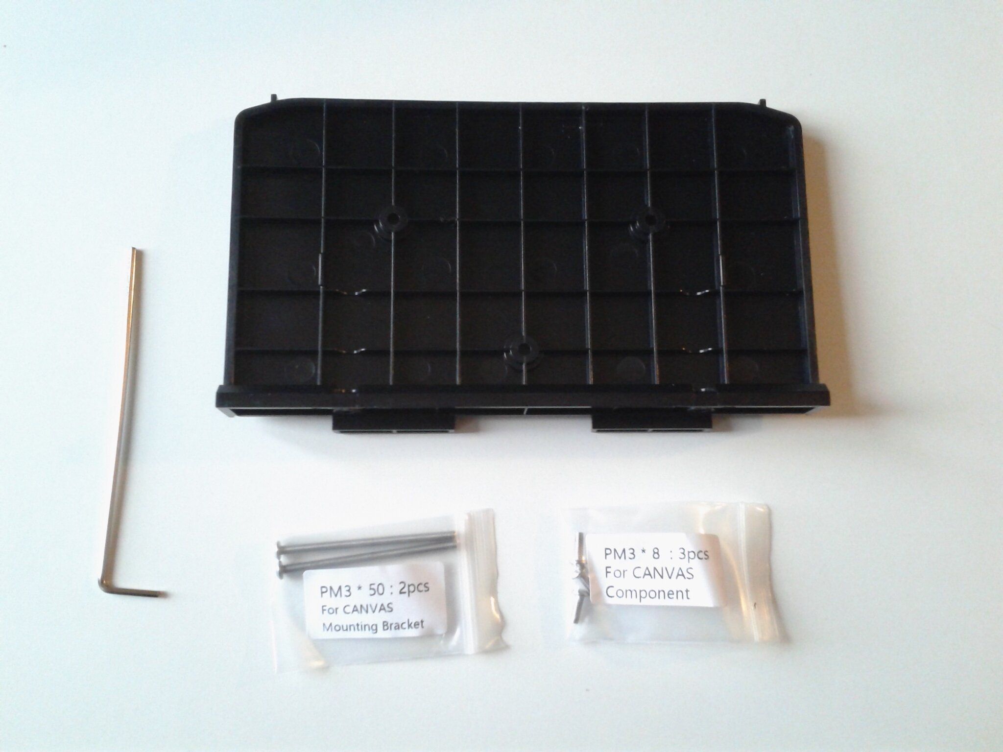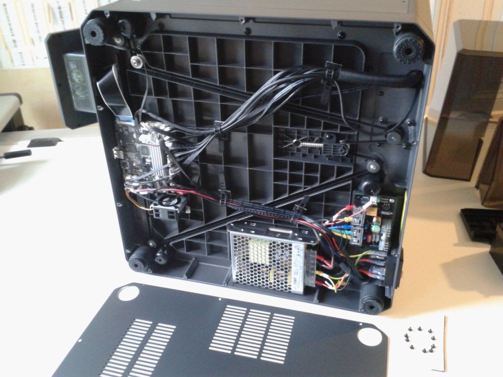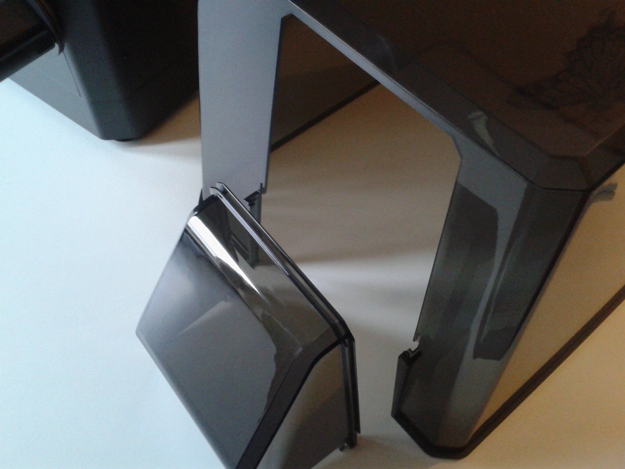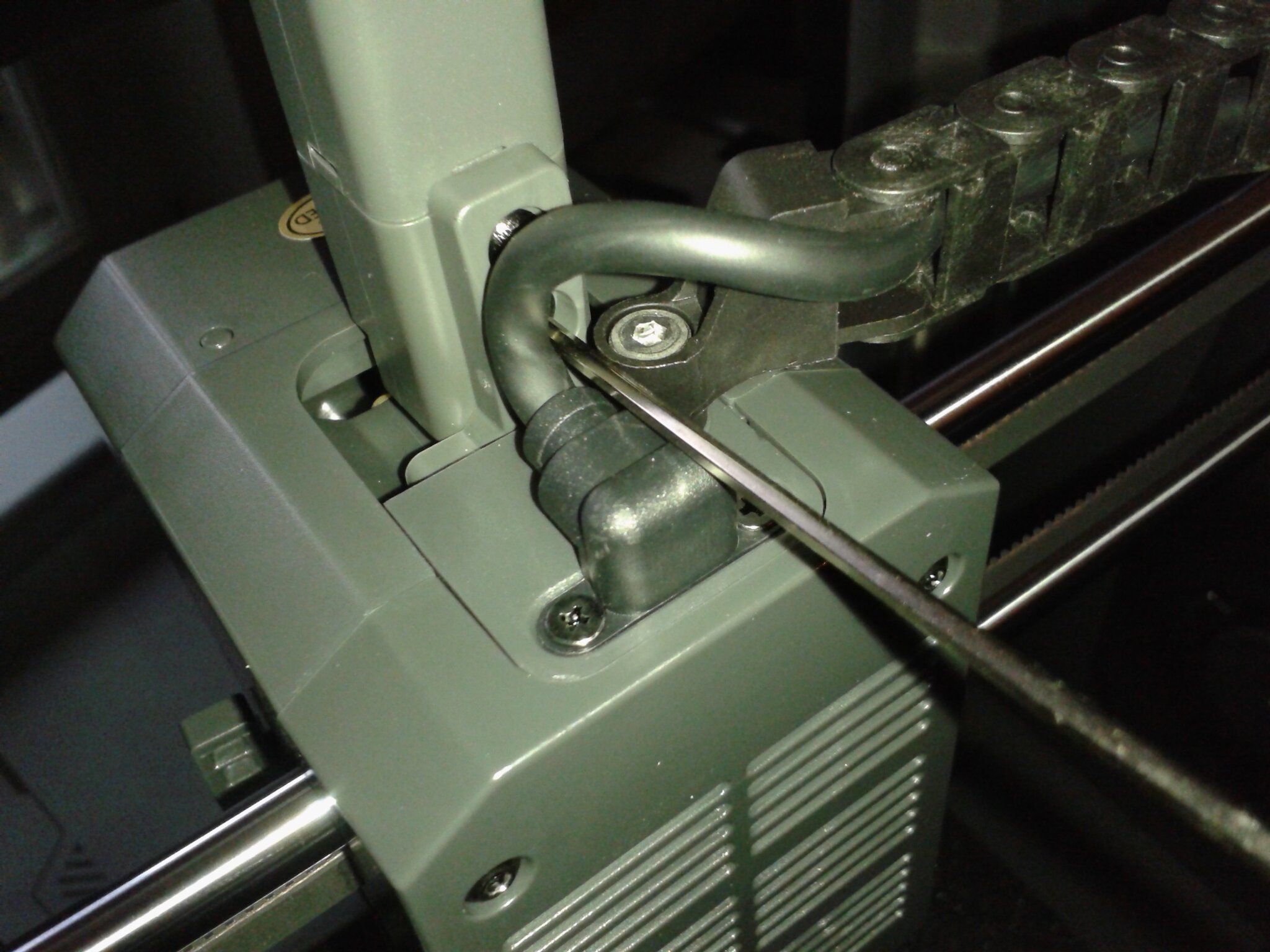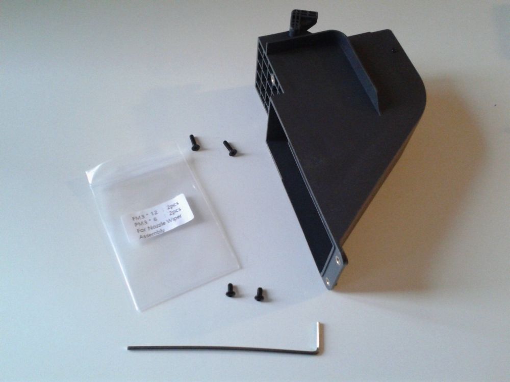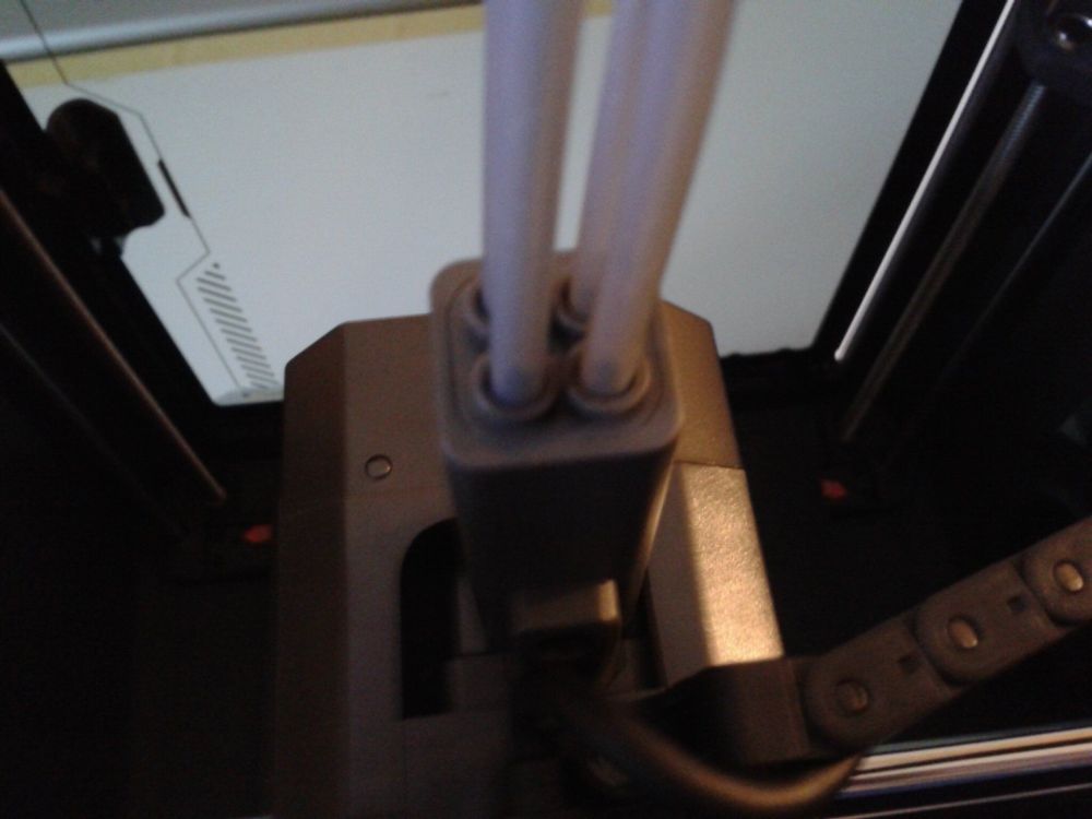 Assemblage C'est relativement simple et prend une dizaine de minutes, tout est détaillé dans la documentation papier fournie. Si pas déjà fait lors du déballage, il faut retirer les trois vis qui sécurisent le plateau lors du transport. Puis Connecter et mettre en place l'écran. Placer et fixer avec quatre vis l'ensemble essuie-buse ("nozzle wiper assembly"). ( On peut ici vérifier que si on déplace manuellement la tête d'impression face puis vers le système essuie-buse que le nez de la buse se trouve bien un poil au-dessus de la partie en métal et que cette partie en métal se déplace d'arrière en avant quand on en rapproche la tête. Tête en face de la partie en métal de la chute du système essuie-buse. Tête poussée contre le système essuie-buse, la partie en métal s'avance avec la poussée de la tête contre le système essuie-buse. ) Installer le support pour le système CANVAS au châssis avec deux vis, Fixer le système CANVAS a son support avec trois vis, insérer le hub-filament (4 entrées, 1 sortie) à l'entrée de la tête d'impression et le fixer avec deux vis, Fixer les quatre supports des porte-bobines mettre en place les portes-bobines (attention bien respecter la numérotation car deux porte-bobines ont un ressort qui tourne à gauche et les deux autres tournent à droite et donc si vous inversez le 1 ou 2 avec le 3 ou 4 cela ne maintiendra plus les filaments légèrement tendus sur les bobines et il y aura risque de nœuds du filament sur ces bobines lors des changements de filaments) Connecter le câble 4 broches du système CANVAS Connecter entre le système CANVAS et le hub filament les 4 tubes PTFE de guidage du filament Remarquer que quand l'on pousse les tubes PTFE dans le hub, une partie du hub est sur ressort. Si vous avez un jour besoin de déconnecter un tube PTFE du hub-filament, il vous faudra un l'outil "PTFE Tube Tool" (fichier d'impression de cet outil dans la mémoire de l'imprimante et fourni sur la clé USB) pour faire cet appui qui pousse cette partie du hub sur ressort pour déverrouiller le système qui bloque les bouts de tube PTFE dans le hub. Assembler les deux parties du couvercle de l'enceinte thermique en calant et glissant la petite partie, et placer l'ensemble sur la machine. Retirer la petite étiquette papier de la plaque flexible et replacer la plaque. Vérifier le filtre derrière la grille