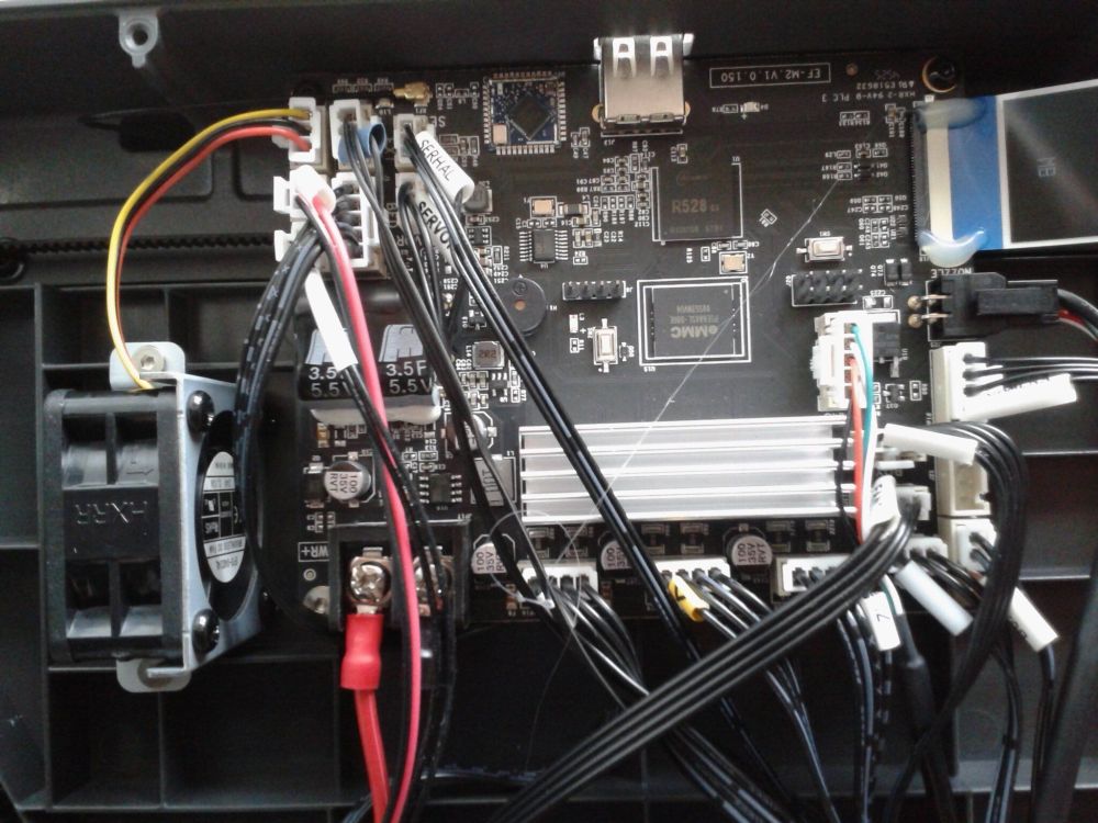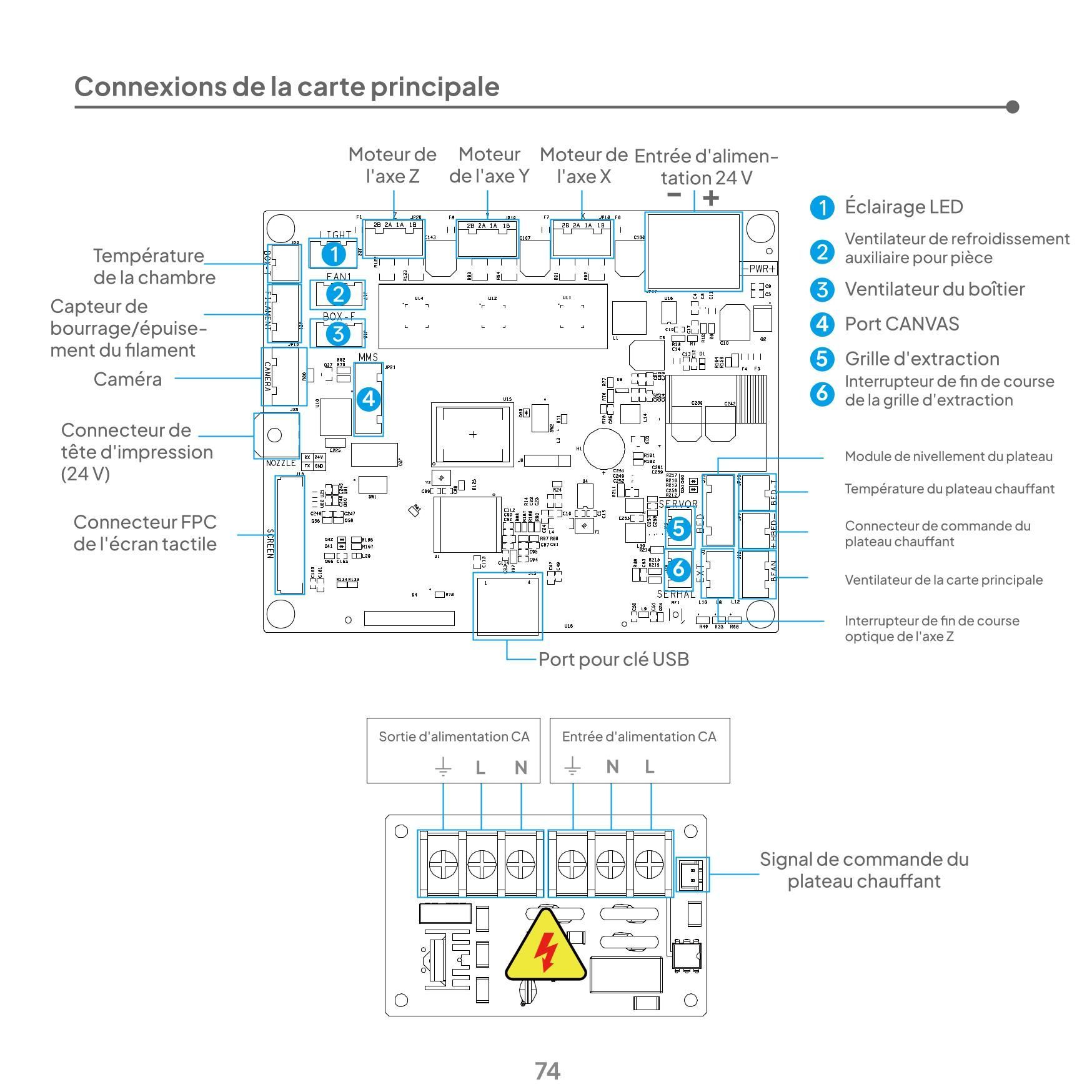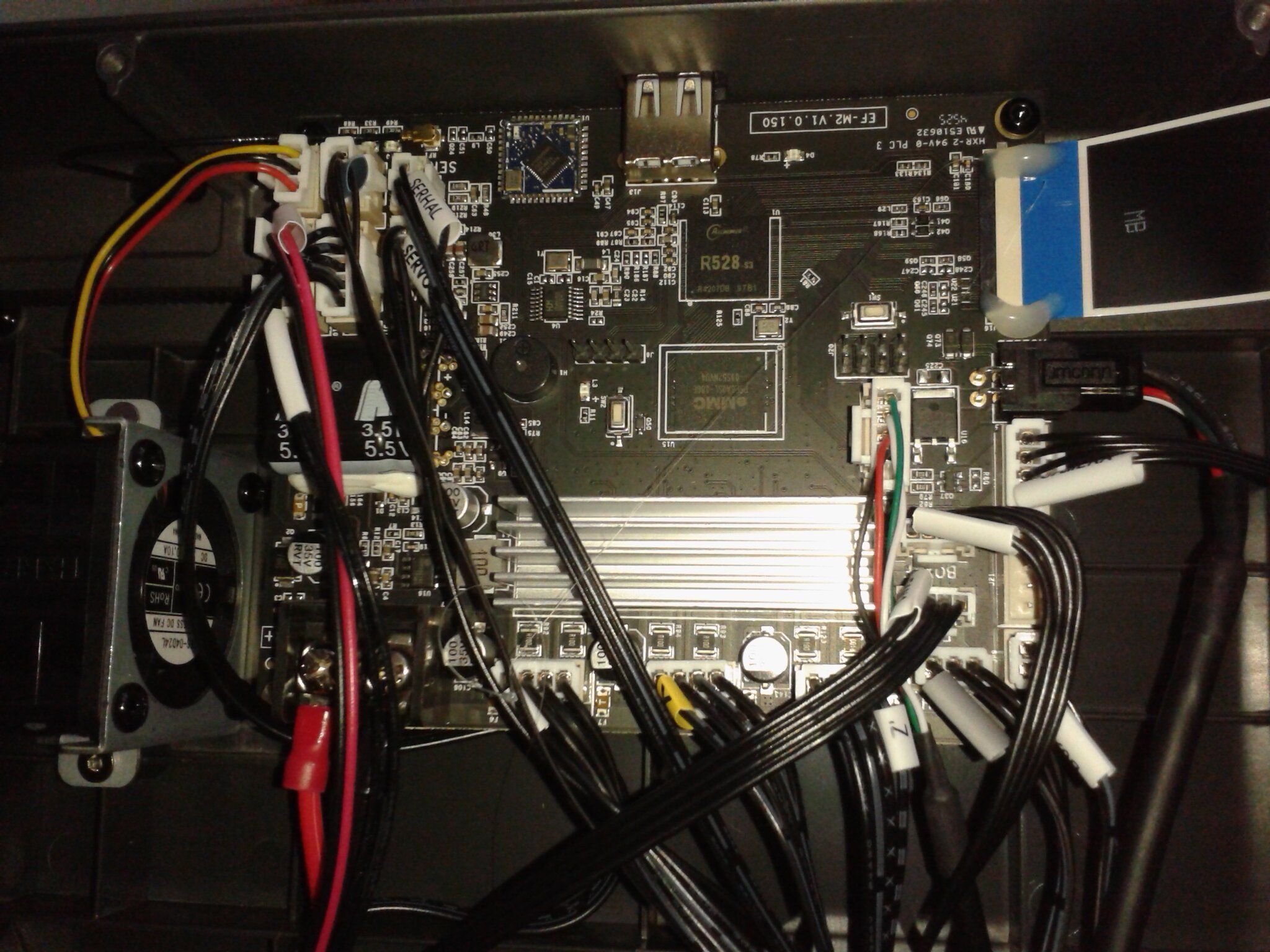 Détails matériels Si on démonte la plaque du dessous Alimentation découpage "CZL-100D-24" sortie 24 V continue, 4,2 A. La carte MOSFET qui alimente le plateau chauffant Une courroie de synchronisation des trois tiges filetées qui déplacent le plateau. La carte mère principale (Microprocesseur "Allwinner R528-S3", puce mémoire eMMC de 8 GB) Ventilateur "EFS-04D24L" 24V 0.01A pour le refroidissement de la carte mère. // À compléter. (photo et détail de la tête d'impression, si on enlève la plaque arrière de la machine, si on regarde le plateau de plus près, ...) --- On peut voir certains détails matériels en parcourant les "Troubleshooting" de la Centauri Carbon 2 sur le wiki d'Elegoo. https://wiki.elegoo.com/en/centauri-carbon-2-combo#troubleshooting sous la machine https://wiki.elegoo.com/centauri-carbon-2-combo/troubleshooting/errorcode-101 (test multimètre alimentation, carte contrôle plateau chauffant, ...) https://wiki.elegoo.com/centauri-carbon-2-combo/troubleshooting/errorcode102 (connexion thermistance plateau) https://wiki.elegoo.com/centauri-carbon-2-combo/troubleshooting/errorcode-205-206 (connexion thermistance chambre) https://wiki.elegoo.com/centauri-carbon-2-combo/troubleshooting/errorcode-304 (connexion fin de course optique Z, connexion moteur Z) https://wiki.elegoo.com/centauri-carbon-2-combo/troubleshooting/errorcode-701 (connexion ventilateur de refroidissement de la carte mère) tête d'impression https://wiki.elegoo.com/centauri-carbon-2-combo/troubleshooting/errorcode-103 (connexion résistance chauffante tête d'impression) https://wiki.elegoo.com/centauri-carbon-2-combo/troubleshooting/errorcode-104 (connexion thermistance buse) https://wiki.elegoo.com/centauri-carbon-2-combo/troubleshooting/errorcode-702 (ventilateur de refroidissement du heatbreak) https://wiki.elegoo.com/centauri-carbon-2-combo/troubleshooting/errorcode-703 (connexion ventilateur de refroidissement de l'impression à la carte de la tête d'impression) https://wiki.elegoo.com/centauri-carbon-2-combo/troubleshooting/errorcode-707 (aimants qui maintiennent le cache avant de la tête d'impression) sous le plateau https://wiki.elegoo.com/centauri-carbon-2-combo/troubleshooting/errorcode-605 (capteurs de déformation aux quatre coins du plateau et la carte où ils sont connectés) https://wiki.elegoo.com/centauri-carbon-2-combo/troubleshooting/errorcode-704 (capteurs de déformation aux quatre coins du plateau et la carte où ils sont connectés) a l'arrière de la machine https://wiki.elegoo.com/centauri-carbon-2-combo/troubleshooting/errorcode-705 (connexion du ventilateur auxiliaire de refroidissement de l'impression) https://wiki.elegoo.com/centauri-carbon-2-combo/troubleshooting/errorcode-706 (connexion du ventilateur d'extraction de l'air de la chambre) ... --- Comme il y a plein de détails que je n'aurais probablement pas abordés, je me permets de citer ici ce qu'a documenté à ce jour (22/03/2026) les personnes qui s'occupent du développement d'OpenCentauri (https://docs.opencentauri.cc). Un grand merci à eux pour tout ce travail. https://docs.opencentauri.cc/hardware/CC2/ https://docs.opencentauri.cc/hardware/CC2/mainboard/ https://docs.opencentauri.cc/hardware/CC2/toolhead/ https://docs.opencentauri.cc/hardware/CC2/screen/ https://docs.opencentauri.cc/hardware/CC2/misc/ https://docs.opencentauri.cc/hardware/CC2/CANVAS/