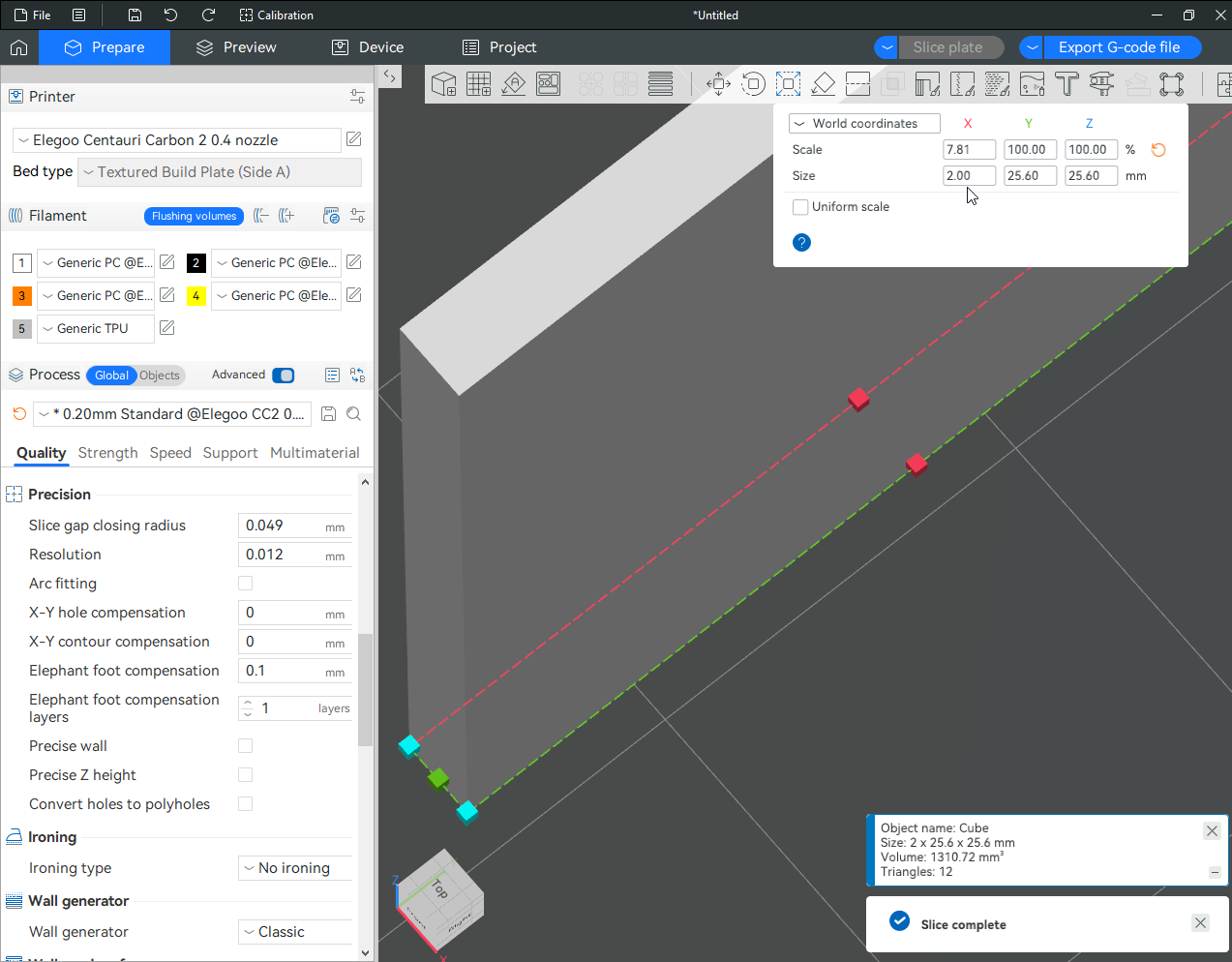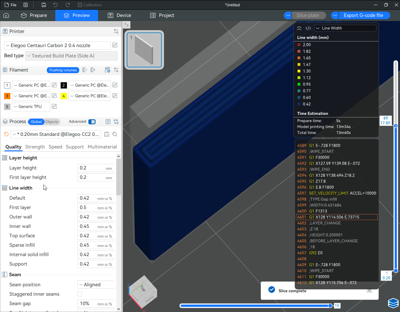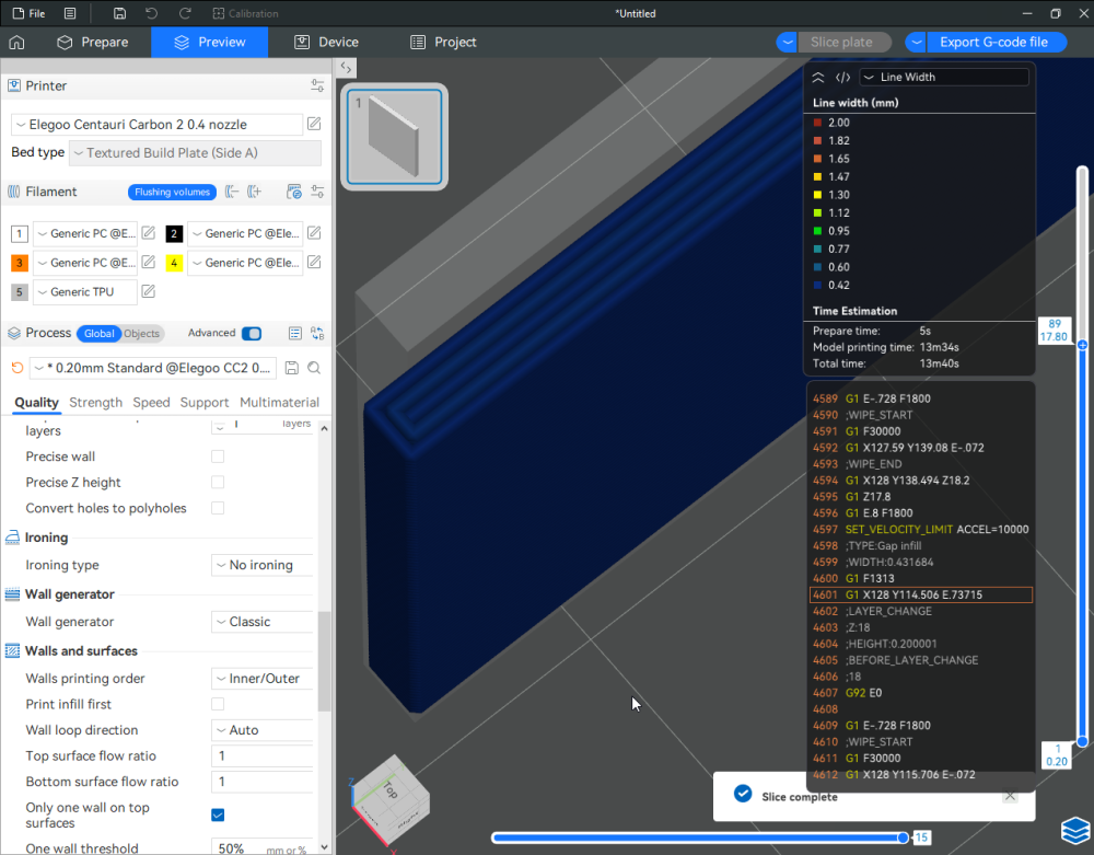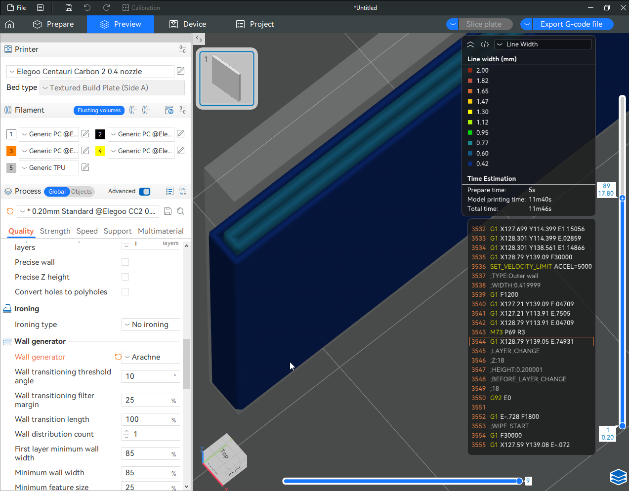 Pas de soucis. C'est technique et éventuellement sans grosse importance si l'épaisseur des murs ne donne pas un mur avec un vide interne à l'impression. Et il faut prendre le temps de regarder couche par couche l'aperçu après découpage en vue largeur de ligne pour voir les subtiles différences de largeur de lignes et s'il y a ou non des vides à l'intérieur des murs ... Exemple d'un modèle d'un mur de 2.0 mm d'épaisseur Si tranché en mode "Arachne" (fait automatiquement varier les largeur de lignes) Si tranché en mode "Classic" (ne fait pas automatiquement varier les largeur de lignes) Sachant que là sous le trancheur les largeur de ligne par défaut sont de 0.42 mm