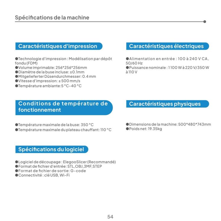 Sommaire Spécifications Réception Déballage et inventaire Détails matériels Assemblage Mise en fonction Détails sur le firmware d'origine Impressions de tests, prétranchées fournies Trancheur / App mobile Accessoires optionnels ou "Upgrades" Difficultés et autres remarques Autres impressions - (Acte I) - PLA ... légende " " = À venir