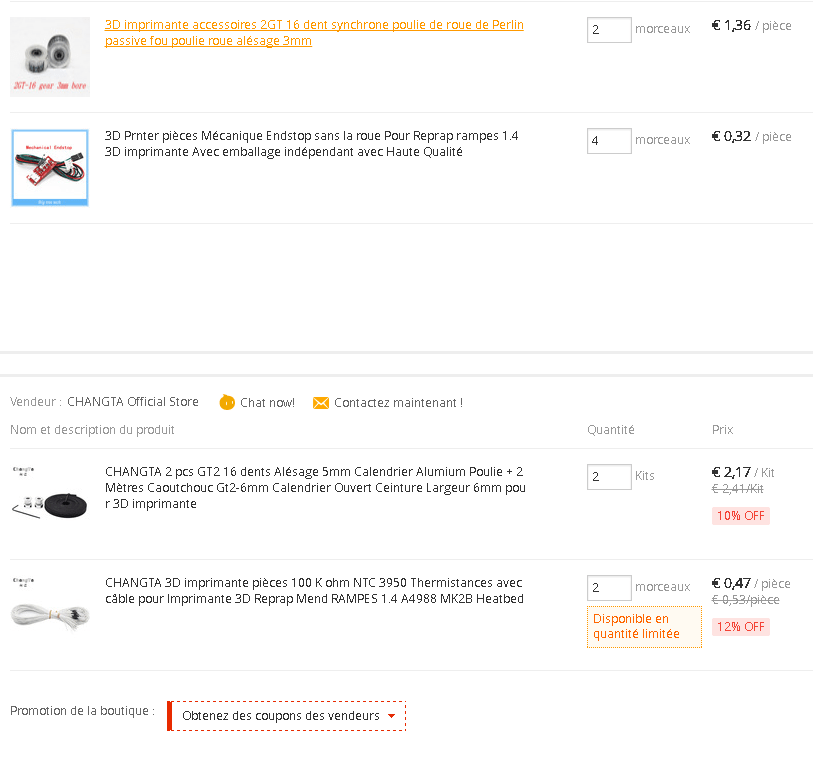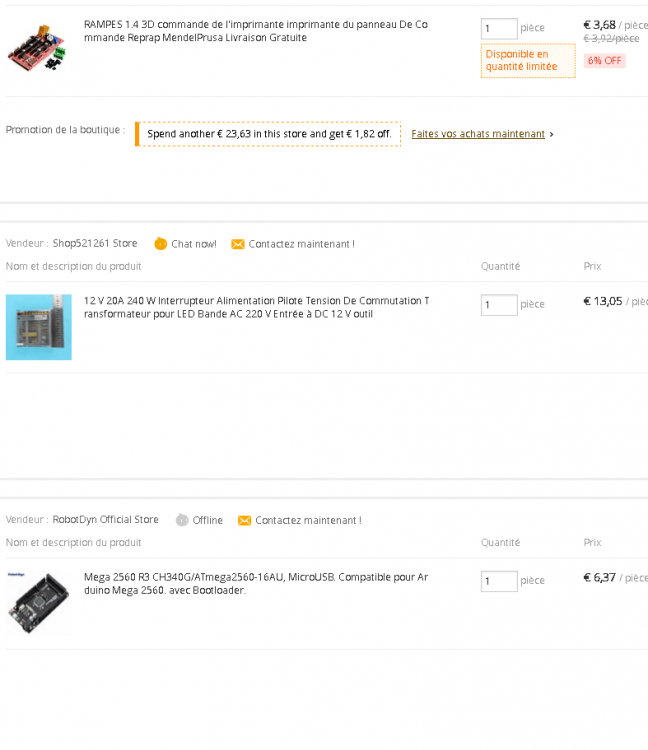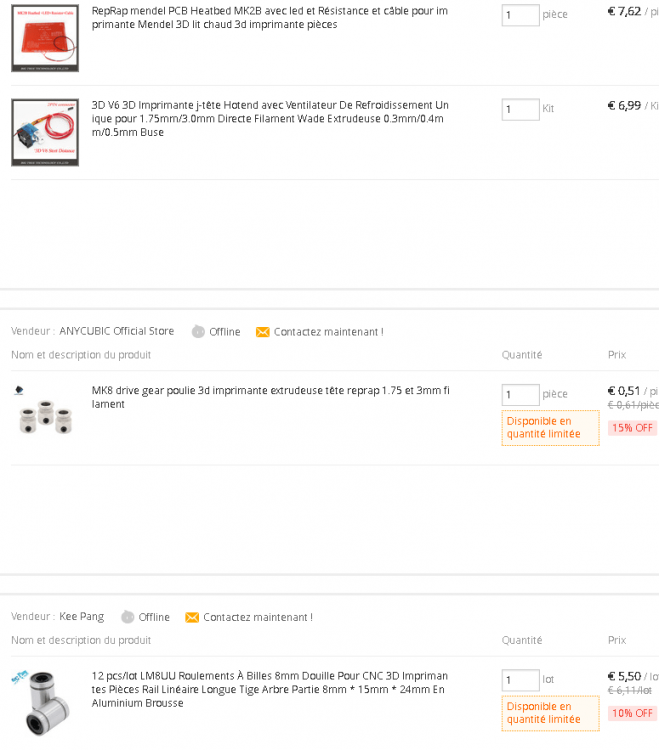 Ok alors j'ai fait pas mal de recherches, je viens de me lever et j'ai dormi 6 heures (pour vous dire :'D ) et je pense m'orienter vers une Prusa MK2 X ! Pour ce qui est des profilés, j'ai trouvé un vendeur polonais, (donc pas de frais de douane il me semble) pour un total de ~60€. Pour tout le reste j'ai fait mes courses sur Aliexpress, il me manque juste quelques petites conneries comme des roulement ou quoi mais je pense ne pas avoir oublié quoi que ce soit. Bien sûr je me doute que le gros atout de la MK2, à savoir la calibration XY automatique, ne sera pas présente sur ma machine, mais le tout m'a l'air vraiment propre et vraiment solide ! En gros il reste le soucis des Vis trapézoïdales et des guides que je ne sais pas ou / quoi commander ! Alors j'aimerai bien que vous me donniez quelques adresses svp J'ai en gros suivi ça : Building the cheapest possible Prusa i3 MK2 - Tom's 3D printing guides and reviews mais ça manque de précisions parfois, et en plus je ne sais pas ce qui est vraiment nécaissaire au montage de l'imprimante (je parle des petits trucs genre poulies etc..) Je vous montre tous les trucs que j'ai prévu d'acheter ( pour les stepper drivers je sais pas si je devrai prendre des A4988 ou des DRV8825, et pour les endstops je ne sais pas trop quoi prendre non plus) : -