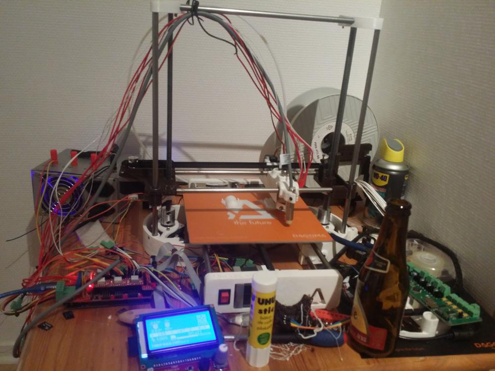 Première vrai impression depuis l'installation de la double tête la disco tourne avec la Ramps, alimentée par une ATX modifiée, impression depuis carte SD... et la melzi est a coté et attend de repartir chez dagoma. le cablage est encore en traveaux. impression terminée collée coloriée. je n'ai pas encore recu le plateau chauffant et j'ai de gros problèmes d'accroche au plateau... donc l'impression n'est pas nickelle, surtout avec la deuxième buse froide qui passe et décolle les premières couches. j'espere que le heatbed corigera le problème. j'attends vos retours lorsque vous aurez installé le système !!
