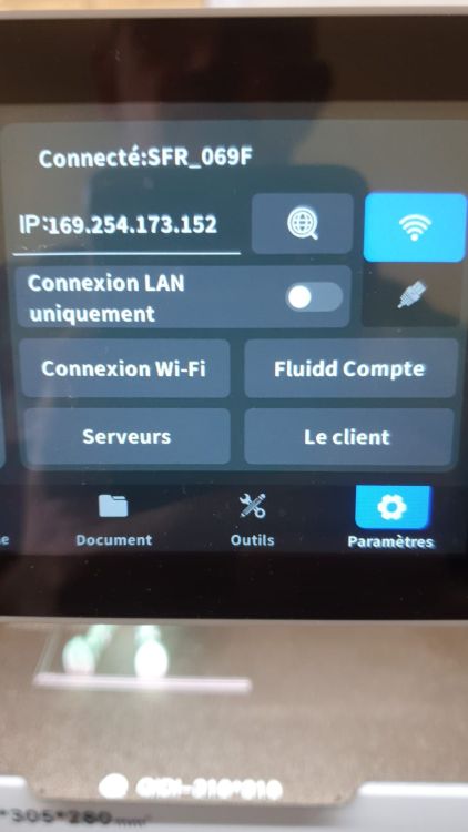 Et oui, mais non... Pour accéder à la console je dois aller dans périphérique et connecter l'imprimante, or... Alors c'est couillon car elle est bien sur le réseau, je la vois dans la console de ma box et dans Qidi Studio. J'ai la bonne ip mais impossible à connecter, donc impossible d'arriber dans Fluidd ou Moonraker.