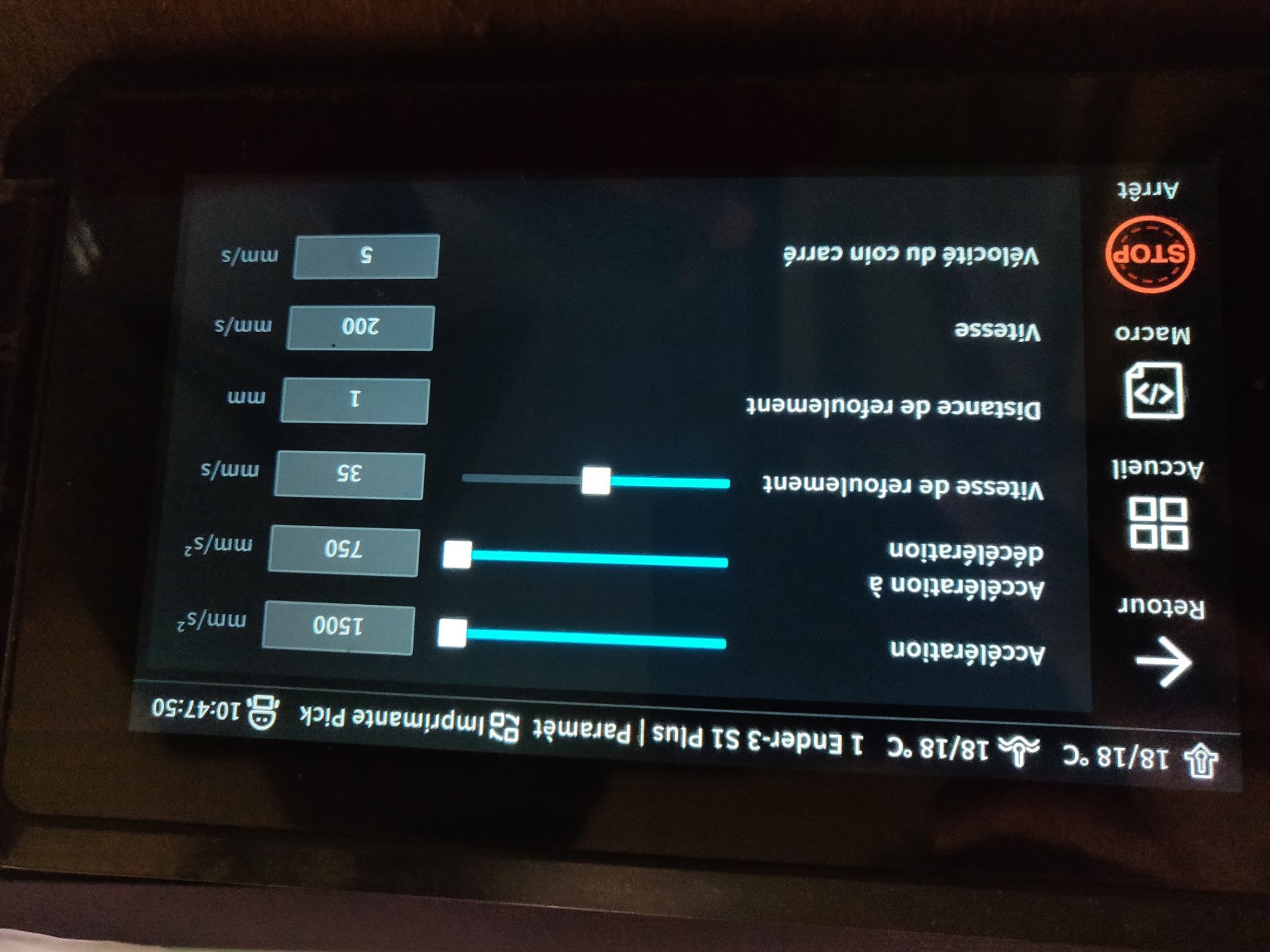 @print51 Il me semble bien, les 1500 mm/s² est peut-être la valeur par défaut de la config de la S1 plus pour le sonicPad. Plus sûrement les valeurs recommandées après les tests de vibration avec le capteur ADXL. Là il faut prendre la valeur la plus faible entre celles de l'axe X et celles de l'axe Y. c'est sur l'axe Y les plus faibles (normal pour une bedslinger) Après cela peut aussi se modifier dans les slicers (en mode all, expert ou avancé,..) -