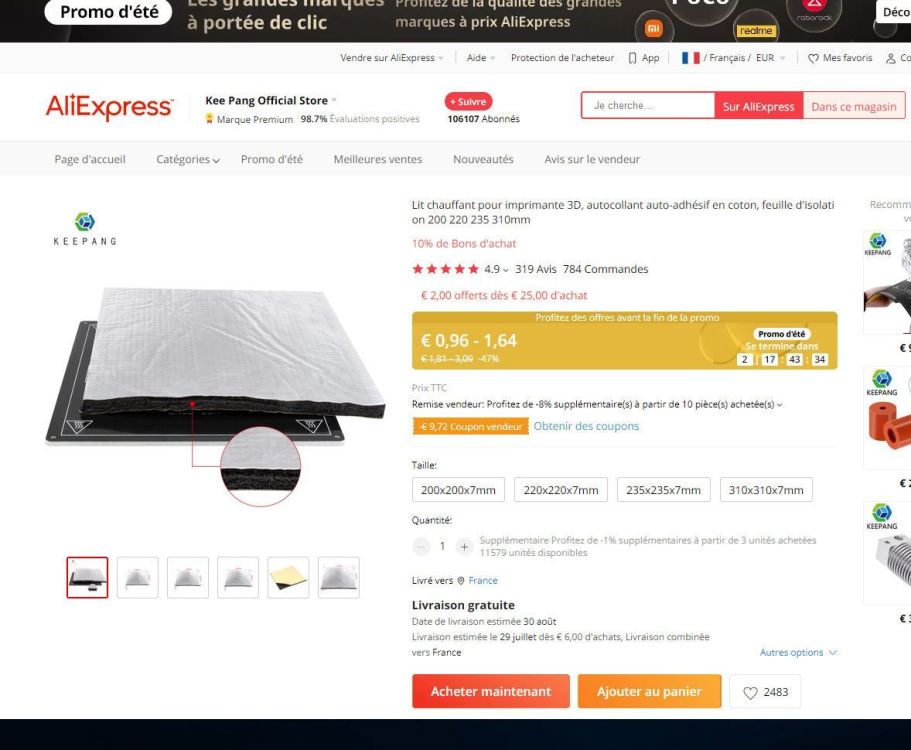 Bonjour, j'ai une CR-10S PRO V2 et j'ai trouvé l'article ci-dessous sur aliexpress, à coller sous la résistance chauffante du plateau. je pense que cela éviterai de chauffer le boitier de la bécane et renverrai plus de chaleur vers le plateau. Toutefois je me demande si cela ne posera pas de problèmes de température ou autres et si oui, lesquels. J'aimerai savoir ce que vous en pensez. Merci d'avance de vos réponses. -