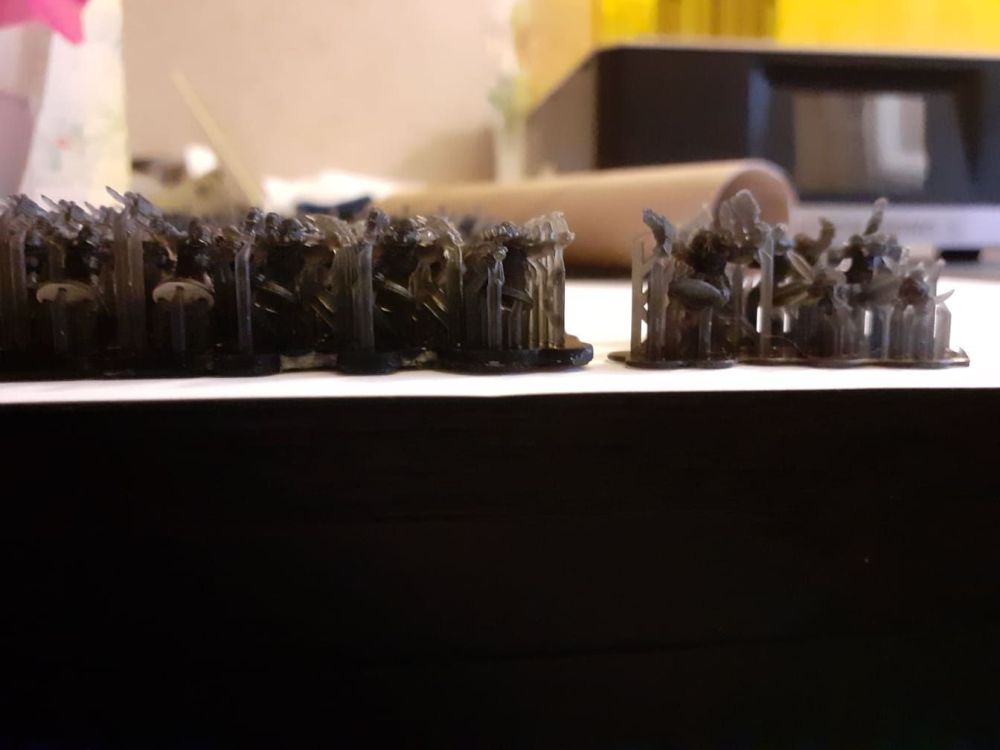 J'ai imprimé hier quelques figurines test avec des layers de 20 microns au lieu de 50 afin de voir si les détails seraient plus poussés et ce fut effectivement le cas. Aujourd'hui, fort de ce premier test je décide d'imprimer un plateau entier avec exactement les mêmes paramètres et je me retrouve avec une base 4 fois plus épaisse au minimum que mon plateau test. Je vous mets la photo