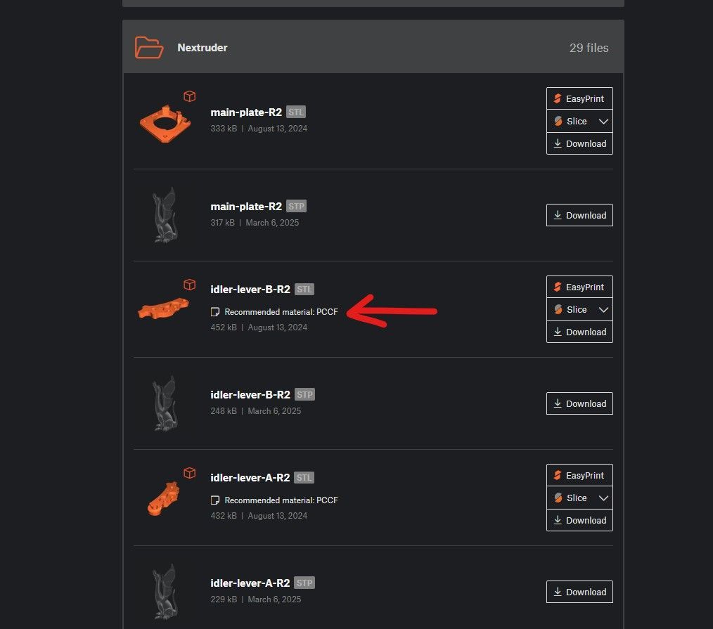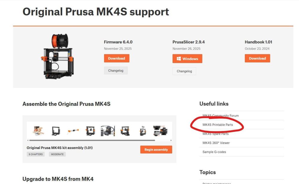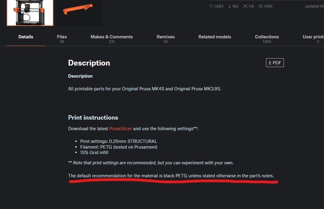 Tu aurais pu la trouver d'occasion en kit ? M'enfin ça n'a pas d'importance, tant que tu sais comment rattraper le coup. Si le guide en nylon est mal positionné tu es bon pour défaire tout le faisceau. Heureusement c'est beaucoup plus simple sur la MK4 que sur les générations précédentes. S'il s'est juste décroché, comme il est coudé aux deux extrémités pour éviter ça justement, ça serait bien de savoir pourquoi avant de le remettre en place. Il n'y a pas de question con. C'est du PETG pour les couleurs Jet Black et Prusa Orange et du PC-CF pour les pièces un peu plus grises et rugueuses. Dans la section d'aide du site de Prusa il y a le lien vers les pièces => https://www.printables.com/model/451500-mk4smk39s-printable-parts De là ils recommandent de faire les pièces en PETG sauf contre-indication. Et on trouve la contre-indication dans le détail des pièces. N'hésites pas si t'as d'autres questions. -