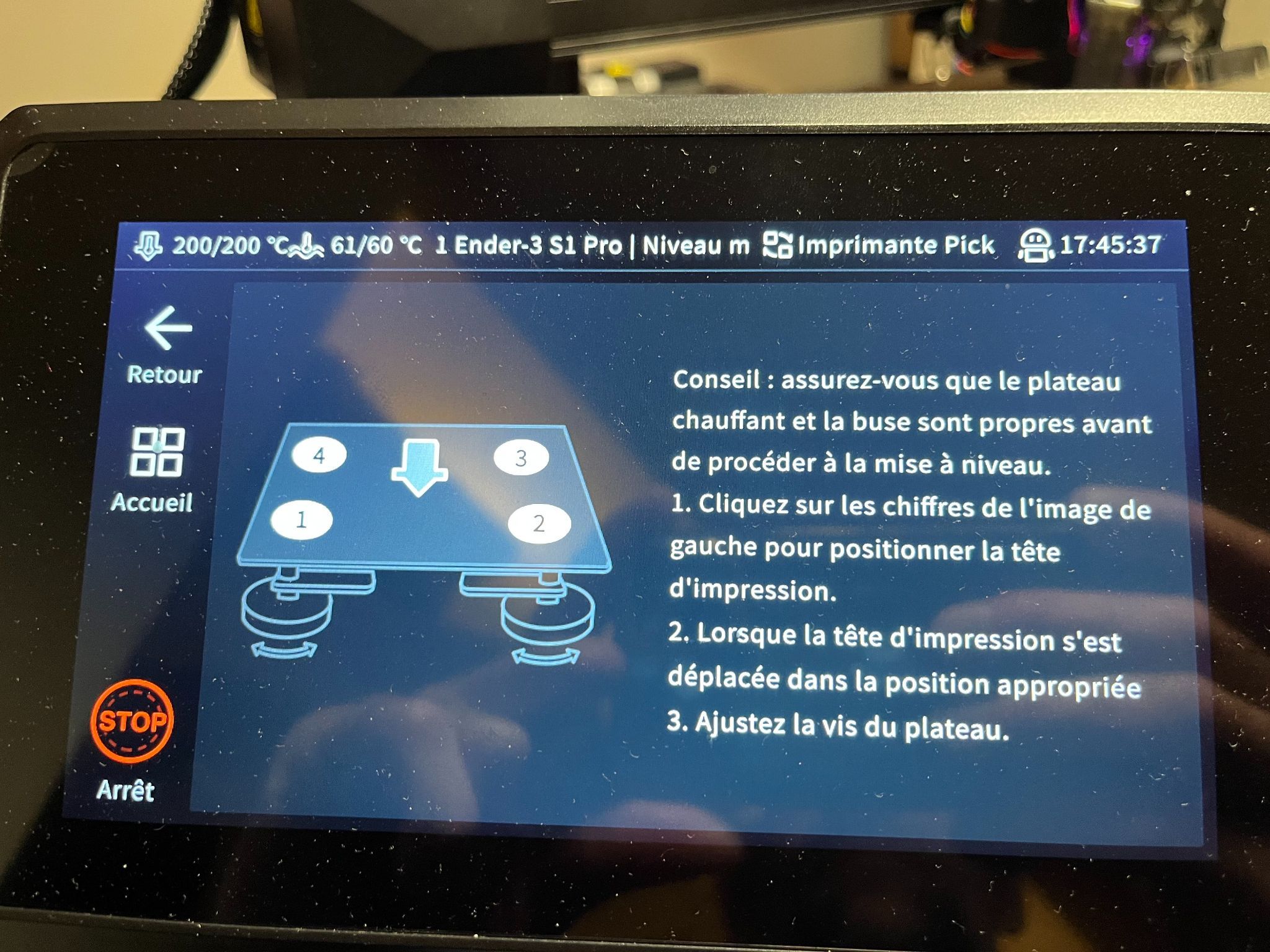 Bonsoir, Je sais que ce sujet revient souvent, mais après avoir consulté de nombreux post et regardé plusieurs vidéos, je me retrouve bloqué. J'utilise un Sonic Pad avec mon imprimante Ender 3 S1 Pro et, suite à une mauvaise manipulation, je n'arrive plus à obtenir des impressions correctes. J'ai refait à plusieurs reprises les réglages de la buse et du plateau, mais les résultats restent insatisfaisants. À force d'accumuler des informations sur le sujet, je suis désormais perdu quant à l'ordre des réglages à effectuer. Voici la méthode que j'ai suivie jusqu'à présent, sans succès : Réglage du Z-Offset (étalonnage de la sonde) en descendant la buse jusqu'à ce qu'elle frotte légèrement une feuille de papier.. 2. Nivellement manuel des quatre coins du plateau, en ajustant les molettes pour obtenir le même frottement de la buse sur la feuille. 3. Nouvelle vérification du Z-Offset pour s'assurer que le buse frotte toujours correctement sur la feuille. 4. Lancement du nivellement automatique . Voici le résultat après avoir effectué le nivellement automatique : Questions : Quelle est la différence entre le réglage du Z-Offset et le réglage du Z ? J'ai lu qu'il fallait ramener le Z-Offset à zéro avant de faire les réglages. Ce réglage se fait-il via les commandes du Z ou du Z-Offset ? J'ai réalisé plusieurs tests d'impression, mais je rencontre toujours des problèmes d'adhérence. Dans la partie haute du plateau , le PLA n'adhère pas correctement et ne colle pas. Au centre du plateau , des espaces apparaissent entre chaque passage de filament, ce qui crée un résultat irrégulier. Malgré cette procédure, mes impressions restent de mauvaise qualité. Auriez-vous des conseils ou un ordre de réglage plus efficace pour résoudre mon problème ? Merci d'avance pour votre aide.