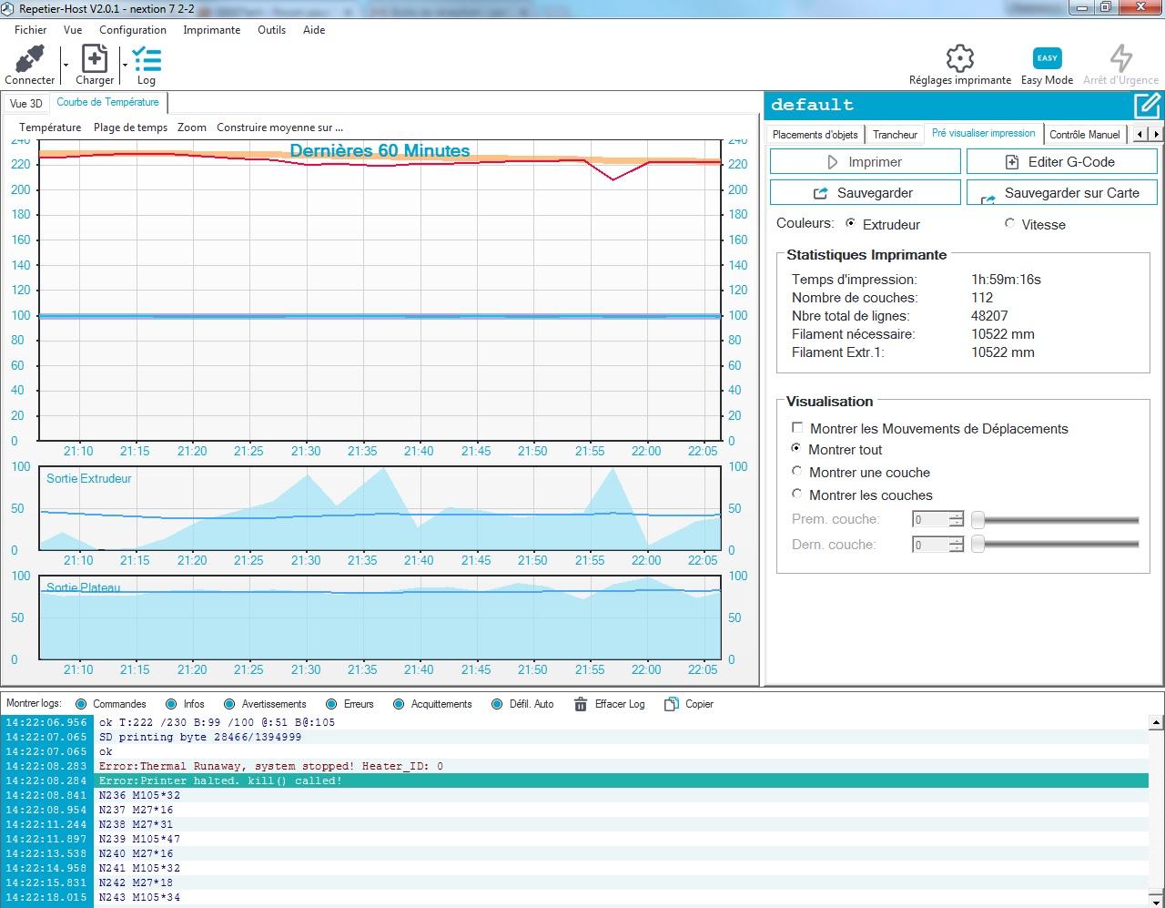 Voila ! J'imprime depuis 31 minutes pas de problème en ce moment t° lit stable 100° et Hotend stable a 230° ! Au final changement Valeur PID apres autotune et changement valeur dans fichier configuration_adv.h et configuration.h Je me suis aider de ce poste : A suivre ! d'ici quelque jours ou semaine changement pour un E3D V6