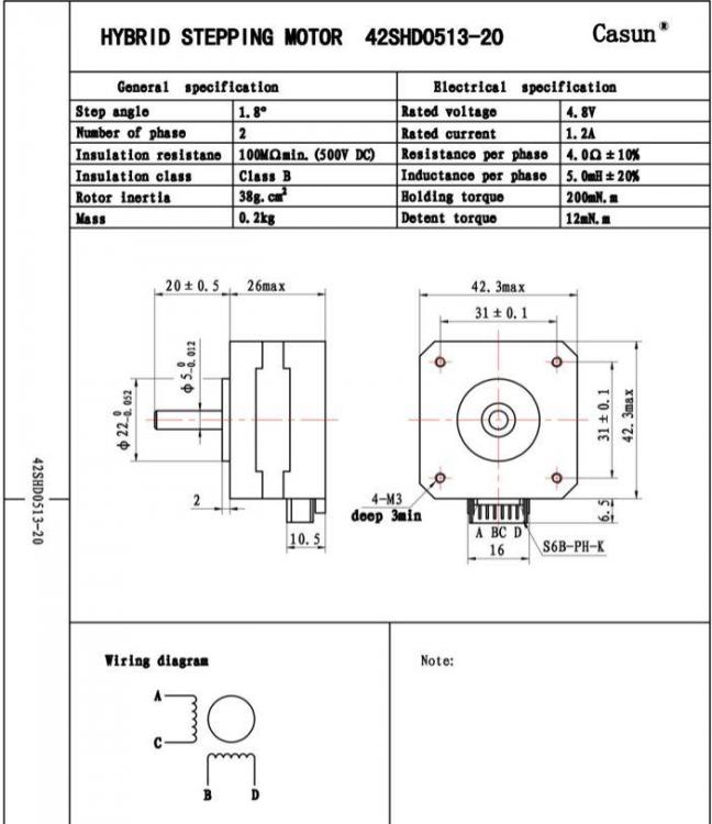 @stef_ladefense, Bonjour, Je viens de relire tout le post et je commence (je crois) à comprendre. Mais quelque chose me turlupine un peu. J'ai réimprimé une un support de hot end (la dernière de Razor) et je vais y mettre un moteur Nema17 "pancake", dont la référence est 42SHD0513-20. Quand je regarde le datasheet de celui-ci (voir ci-dessous) je vois "rated current : 1.2 A". Or en faisant une traduction de "Rated current", j'obtiens "Courant nominal". Du coup, je ne sais plus ou j'en suis… C'est le Imax ou le Inom ??? Dois-je le réduire à 71% ou pas, dans la formule ? -