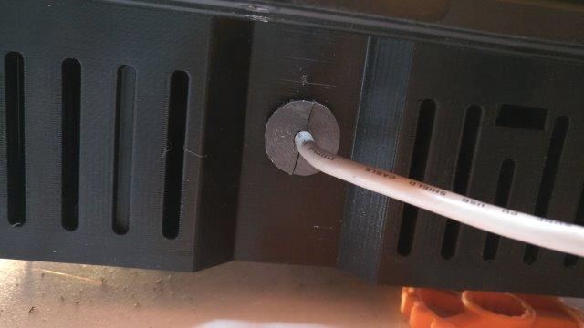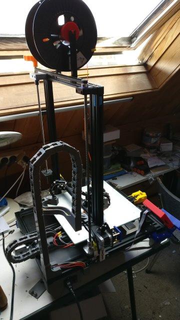 Comme promis à @razor, voilà les photos de mon imprimante modifiée avec son projet. Je tiens encore à le féliciter pour le professionnalisme dont il a fait preuve pour cette réalisation. Bon, je précise tout de suite que je n'ai pas fait dans l'esthétique (couleurs,... J'ai fait avec ce que j'avais.) mais plutôt axé sur le fonctionnel. Et je suis ravi. Pour moi, c'est nickel. J'ai eu quelques difficultés pour le placement des fils pour le bed, mais j'y suis arrivé. Comme on peut le remarquer, j'ai fais en sorte de pouvoir démonter mon bed facilement sans toucher au câblage qui se trouve dans la chaîne. Impression en PLA, 0.25, 50% remplissage. Une petite précision, sur une des photos, vous verrez que j'ai fait une petite modification pour pouvoir introduire le câble USB relié à la carte. Je ne me voyais pas retourner l'imprimante et ouvrir le couvercle à chaque fois que j'avais besoin de l'USB, ne fut-ce que pour piloter l'imprimante par Pronterface ou Repetier. J'ai juste fait un trou de 16 mm et deux pièces qui viennent s'emboiter dedans en coinçant le câble USB, qui reste à demeure. J'aimerais bien avoir le lien pour la tête montrée plus haut. C'est possible ? Voila, voila… Et mes excuses pour le bordel -