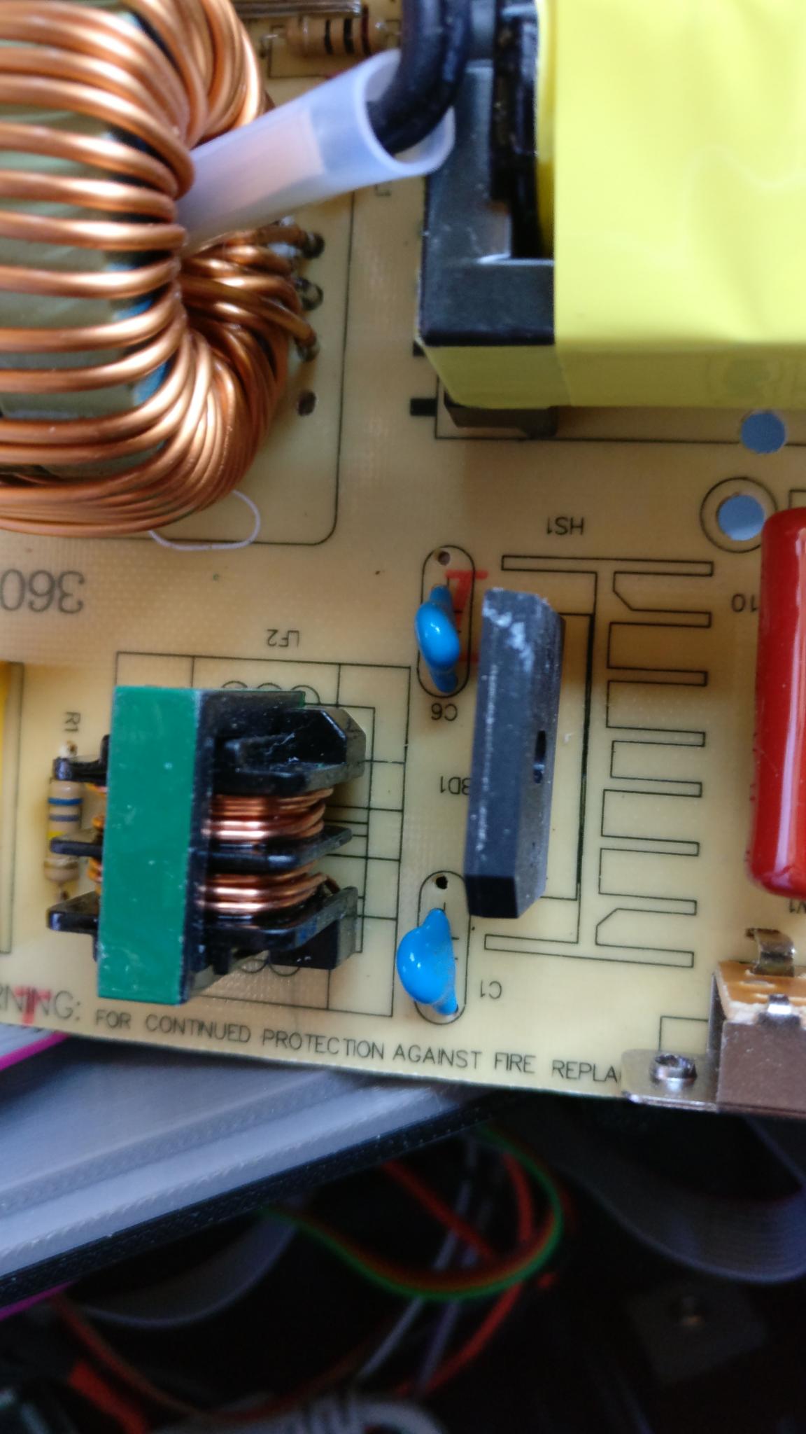 @Locouarn, Ben contrairement à ce que l'on pourrait penser, non, le fusible de l'alimentation n'a pas fondu. Ni celui qui est dans l'interrupteur, du reste. Le seul qui a déclenché, c'est le disjoncteur dans le tableau de la maison. La CM ne semble pas avoir été touchée. Quand je l'alimente avec l'USB, elle démarre normalement et les écrans s'affichent correctement. C'est déjà ça. De toute façon, j'ai commandé une nouvelle alim chez Ali... @Kachidoki, Oui, la trace blanche en-dessous de la grosse bobine est un reste de colle. Quand à la vis dans le plastique, non, il n'y a aucune chance qu'elle aie touché le PCB. Et si ça avait été le cas, on verrait une trace de coup d'arc dessus. Et, en effet, je me suis dit la même chose. Dessin d'un refroidisseur, et … pas de refroidisseur !