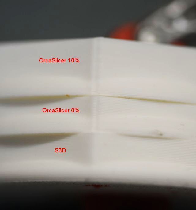 Bonjour, Par curiosité j'ai effectué quelques essais des réglages de couture sous OrcaSlicer. Voici 3 impressions de la même pièce PLA+ eSUN. C'est une base d'un manche de blaireau à facettes de 40mm de diamètre. C'est du PLA+ de chez eSUN 210°/60°, 96% de débit, 3 parois, rétraction 0.4mm-30mm/s sur une Voron 0 en buse de 0.4mm. Même à l’œil nu il n'y a aucune différence avec entre 10%(par défaut) et 0%. Avec les mêmes paramètres dans S3D, la couture est invisible. Pour repérer la "couture" il faut regarder sous la pièce. S3D n'a pas de fonction de réglage de couture. Je vous laisse conclure.