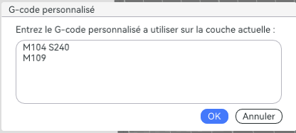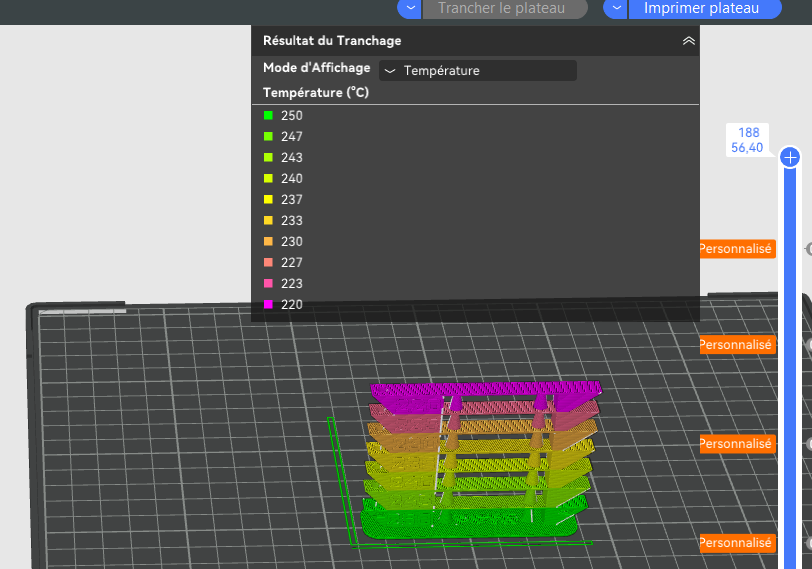 @PPAC, merci pour ce lien, je ne l'avais pas trouvé dans mes recherches. QIDI Studio étant dérivé de BAMBU Studio comme l'a noté @fran6p, j'étais allé sur MAKERWORLD et j'avais trouvé un autre modèle de tour. A partir de l'onglet APERCU, sur la droite de l'écran : La barre des couches et avec le clic droit de la souris, a partir de la couche qui va bien cliqué sur ajouter un G-code. J'ai ajouté le texte '' M104 S(Température qui va bien). C'est bien la même formule que sur ton lien. J'ai obtenu cela ( aprés avoir compris qu'il fallait également choisir la température maximale comme température d'impression dans le profil du filament ...... ) : Je n'ai pas encore lancé l'impression pour voir si c'est OK. Par contre il me semble qu'il manque une temporisation afin que la température de la buse retombe '' de x°C '' afin de poursuivre l'impression. Je pense rajouter la commande M109. Qu'en pensez vous ? Est-ce correct ?