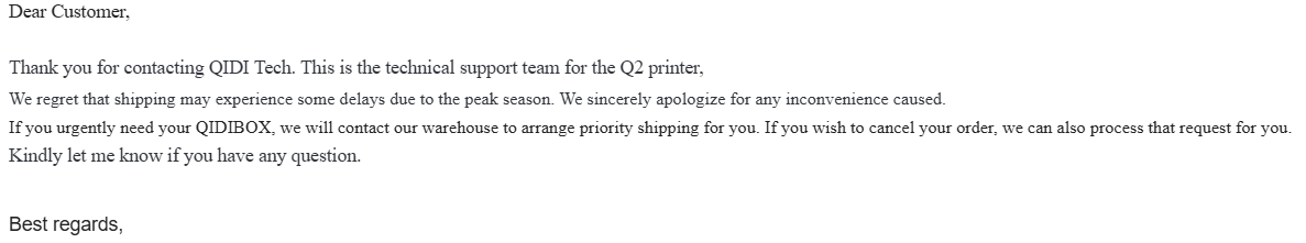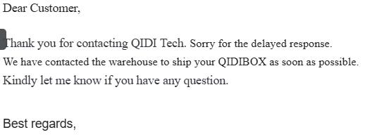 Récemment j'ai eu un petit soucis avec le ventilateur du hot end, le plastique s'est désagrégé au niveau de la vis, j'ai donc contacté le SAV par mail, et après quelques échanges(avec le décalage horaire, les réponses arrivent dans la nuit), au bout de 15 jours(expédition depuis la chine) j'ai reçu 2 ensembles complets de ventilateurs avec les vis, celui du hot end et celui de la buse, ils m'ont indiqué que s'il y avais de frais de douanes, ils me les rembourserai. 2 semaines plus tard, le SAV m'a recontacté pour savoir si tout était OK !!! je lui ai répondu que tout fonctionnait bien, mais que j'attentais toujours ma QIDIBOX qui aurait dû arriver fin octobre(2 mois après la commande), ils se sont excusés du retard et m'ont indiqué que si mon besoin était urgent, ils demanderaient une expédition prioritaire: je leur ai dit que j'avais des commandes de figurines pour Noël, ils m'ont répondu qu'ils avaient fait la demande à l'entrepôt. Résultat : 4 jours plus tard la QIDIBOX était à la maison !!! j'avais lu ici et là que le SAV QIDI était bon mais je ne m'attendais pas à ça.