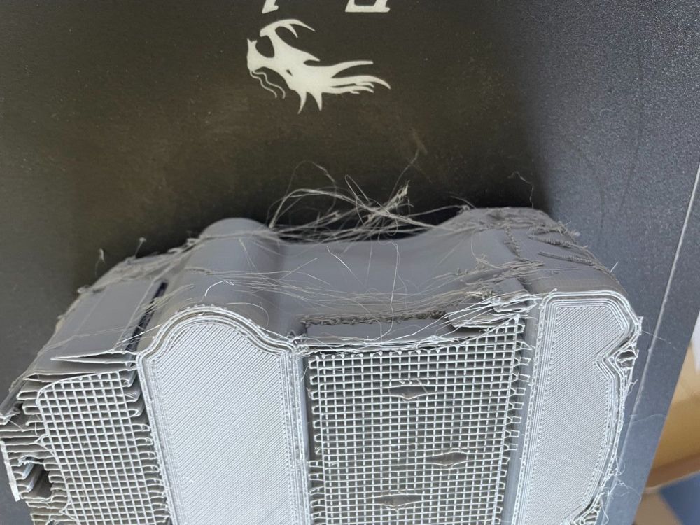 Bonjour, Alors, on a fait pas mal d'essais. C'est clair que ça marche mieux avec le M256. ;) Donc, on a réussi à imprimer correctement deux pièces qui constituent le couvercle d'un boitier. Des petits soucis au démarrage avec quelques fils qui trainent, mais globalement ça s'est bien passé. En fait, on début, on a arrêté l'impression 5 ou 6 fois, parce que l'on trouvait que ça partait mal, et puis on a fini par laisser l'imprimante faire et on a eu une pièce correcte. On a mis 120% pour la couche initiale et M256 Z0,1 . Donc sur la lancée, on s'est dit imprimons le corps principal du boitier. Et là ben on va dire que ça s'est moins bien passé. Alors c'est vrai que l'on n'a pas refait le nivellement du lit et on a mis la qualité sur dynamique, mais qd même. On a des fils partout, je ne comprends pas ça a complètement merdé. Franchement, de très mauvaises finitions, les supports qui laissent des marques incroyables et des filaments dans tous les sens. Quelle déception ! Ci-joint, l'export HTML de Cura pour le couvercle et quelques photos pour comprendre, les démarrages ratés et le résultat catastrophique du boitier. Et là je n'ai pas compris, normalement, les supports s'enlèvent bien, mais là c'est un vrai carnage une fois enlevés. Je ne comprends pas pourquoi on a réussi à imprimer correctement les 2 pièces du couvercle et que le corps principal du boitier a pu être autant raté. CE5_Drone_Lid_bottom.html Et le boitier terminé. On voit que le couvercle est OK, mais le reste ...