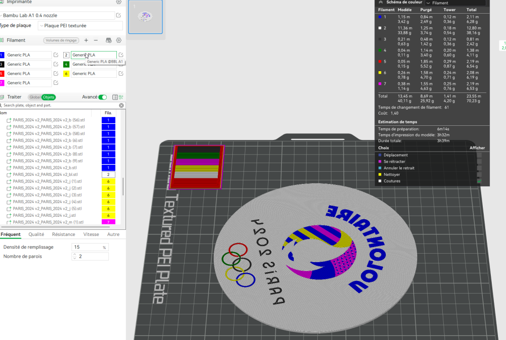 Bonjour, Je souhaiterais faire ce design, mais y'a 7 couleurs, soit si je compte bien 3 de plus que l'AMS Le problème c'est que je ne peux pas mettre de pause étant donné que les changements des filaments interviennent sur une même couche, y'a-t-il un moyen de forcer une pause quand le filament n'est pas dans l'AMS ? Merci PS: je modifierai mon design pour réduire le nombre de changement de filament car la 60 c'est beaucoup trop -