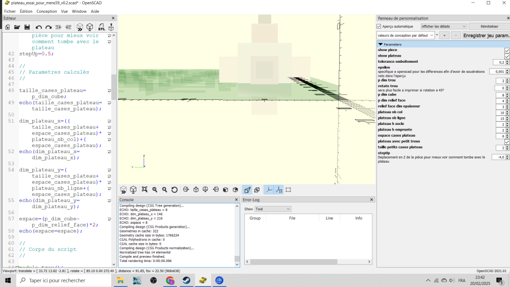 Merci @PPAC J'ai téléchargé OpenSCAD pour lancer ton fichier. Pour le plateau c'est vraiment top, j'ai pu agrandir la largeur des tranches indépendamment des trous donc c'est parfait. A partir de maintenant ce que je n'arrive pas à modifier et qui est indispensable pour s'adapter à la nouvelle taille du plateau, c'est de pouvoir modifier la taille de la partie rose qui sort du cube. Elle est actuellement de 1mm j'ai l'impression, il faudrait pouvoir la modifier car quand j'augmente "espace case plateau", il faut également augmenter cette partie. Il faudrait qu'elles fasse au minimum 2mm pour correspondre à l'épaisseur du plateau, et donc toucher le sol. Ainsi avec une largeur de 4mm pour les tranches du plateau on a bien les 2 cubes qui se rejoignent (2 x 2mm). Dis le moi si j'en demande trop surtout. Pour moi je trouve ça ultra complexe, et je ne sais pas combien de temps ça te prends. Je ne veux pas abuser de ta gentillesse surtout ! Ne t'embête pas à améliorer le code, je peux tout à fait faire correspondre chaque valeur, sans qu'elles ne se modifient automatiquement. Je n'ai juste pas réussi à modifier l'épaisseur de la partie rose (la taille oui mais pas la taille de la partie qui sort du cube blanc). EDIT : j'ai l'impression qu'en modifiant "p dim relief face" ça modifie la taille selon une échelle, si on réduit la pièce ressort davantage, mais si on agrandi, la pièce ressort moins. -