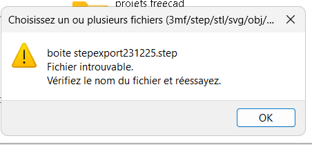 joOJ j'ai bien essayé mais quelque chose cloche , dans freecad c'est bien STEP with colors qu'il faut prendre ,je l'exporte , mais lorsque je veut l'importer dans orca , j'ai le message fichier introuvable vérifier le nom du fichier et réessayer? même si je ne change pas le nom qui est donné par freecad .