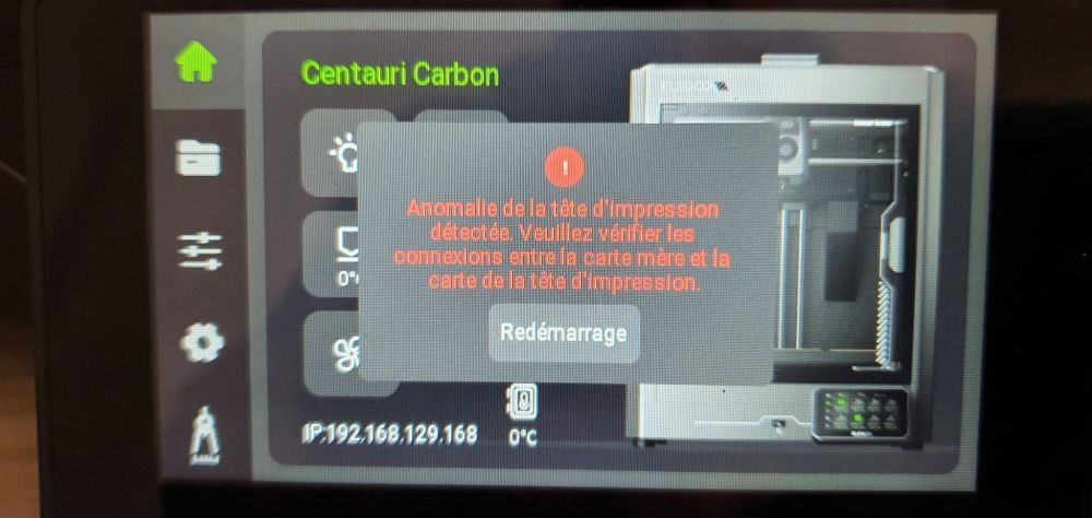Un petit retour sur le sujet : j'ai une panne depuis hier matin (voir photo). Sur le WiKi Elegoo, j'ai trouvé une procédure dans le "troubleshooting , je l'ai suivie à la lettre. Je me suis ensuite adressé à mon vendeur (3dJake) qui m'a renvoyé vers euservice@elegoo.com. J'ai envoyé la photo, copie de ma facture et n° de série. Je viens de recevoir la confirmation de l'envoi d'un nouveau câble de connexion, d'une nouvelle carte-mère et d'une nouvelle carte-fille (celle qui est dans la tête d'impression). Tout ça n'aura pris que 24h... Je posterai à nouveau quand j'aurai reçu les pièces.