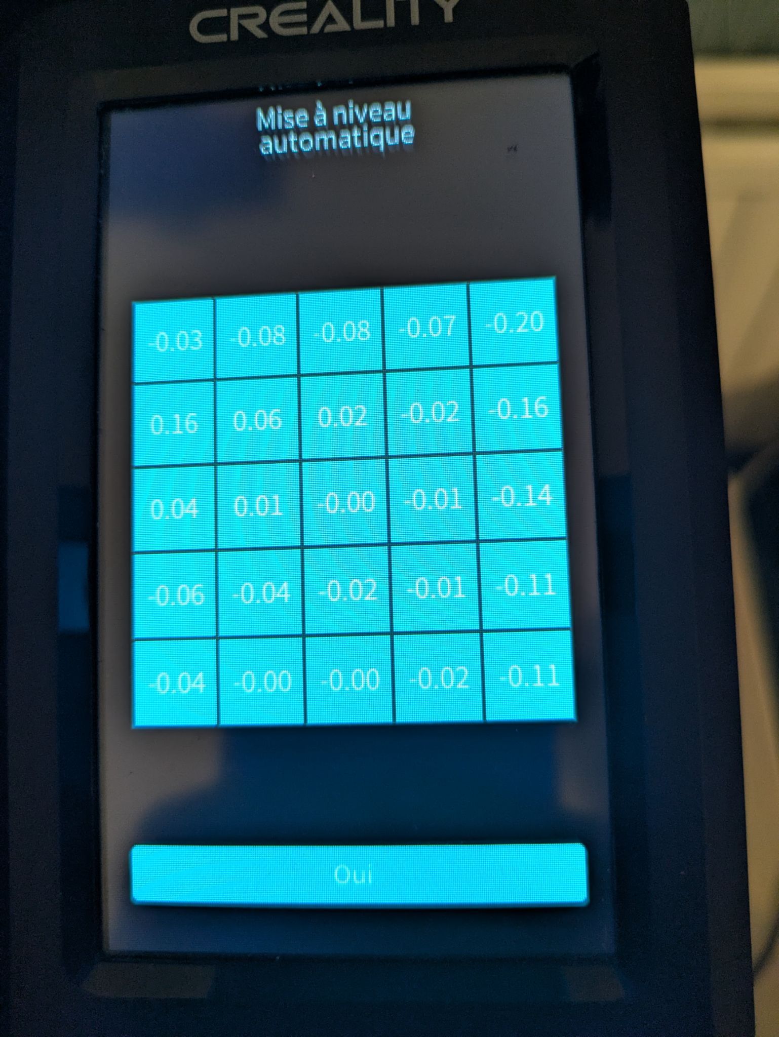 La calibration auto se fait bien, je laisse l'offset Z que la machine choisit. J'imprime en PLA, avec 205 degrés en buse pour la première couche et 65 pour le tapis chauffant.