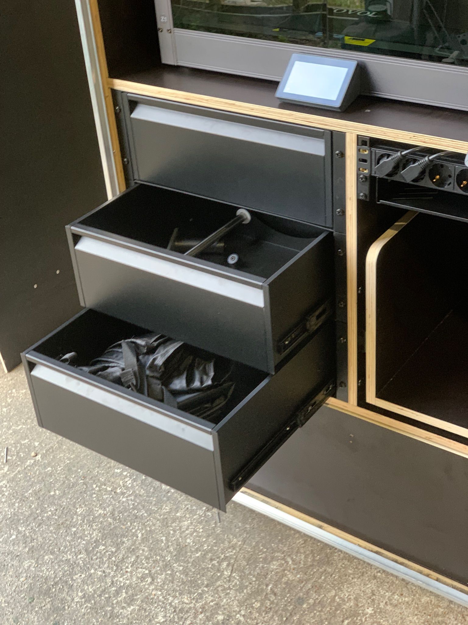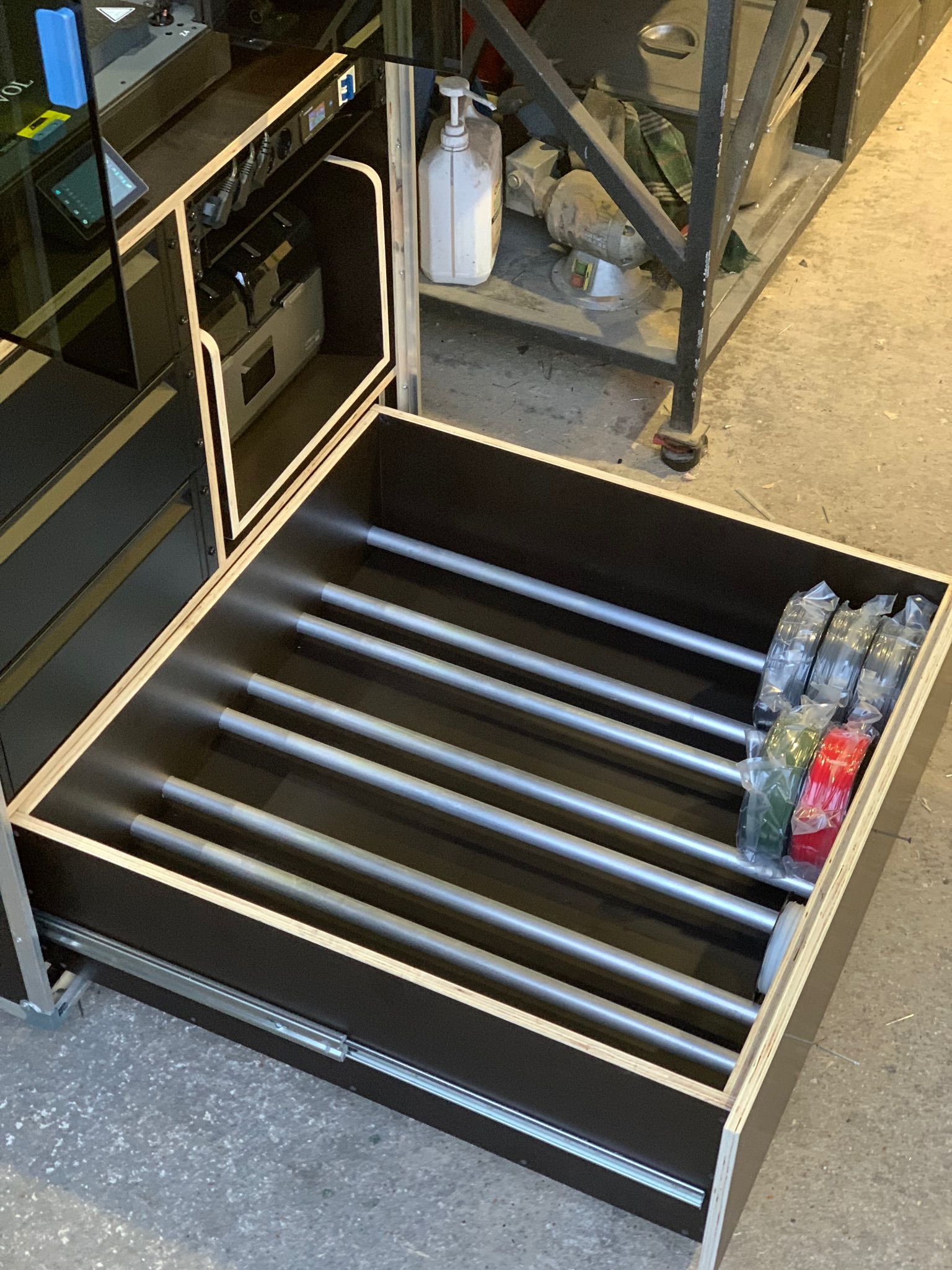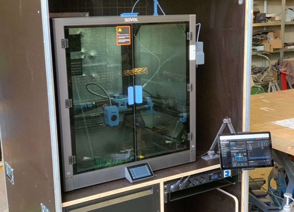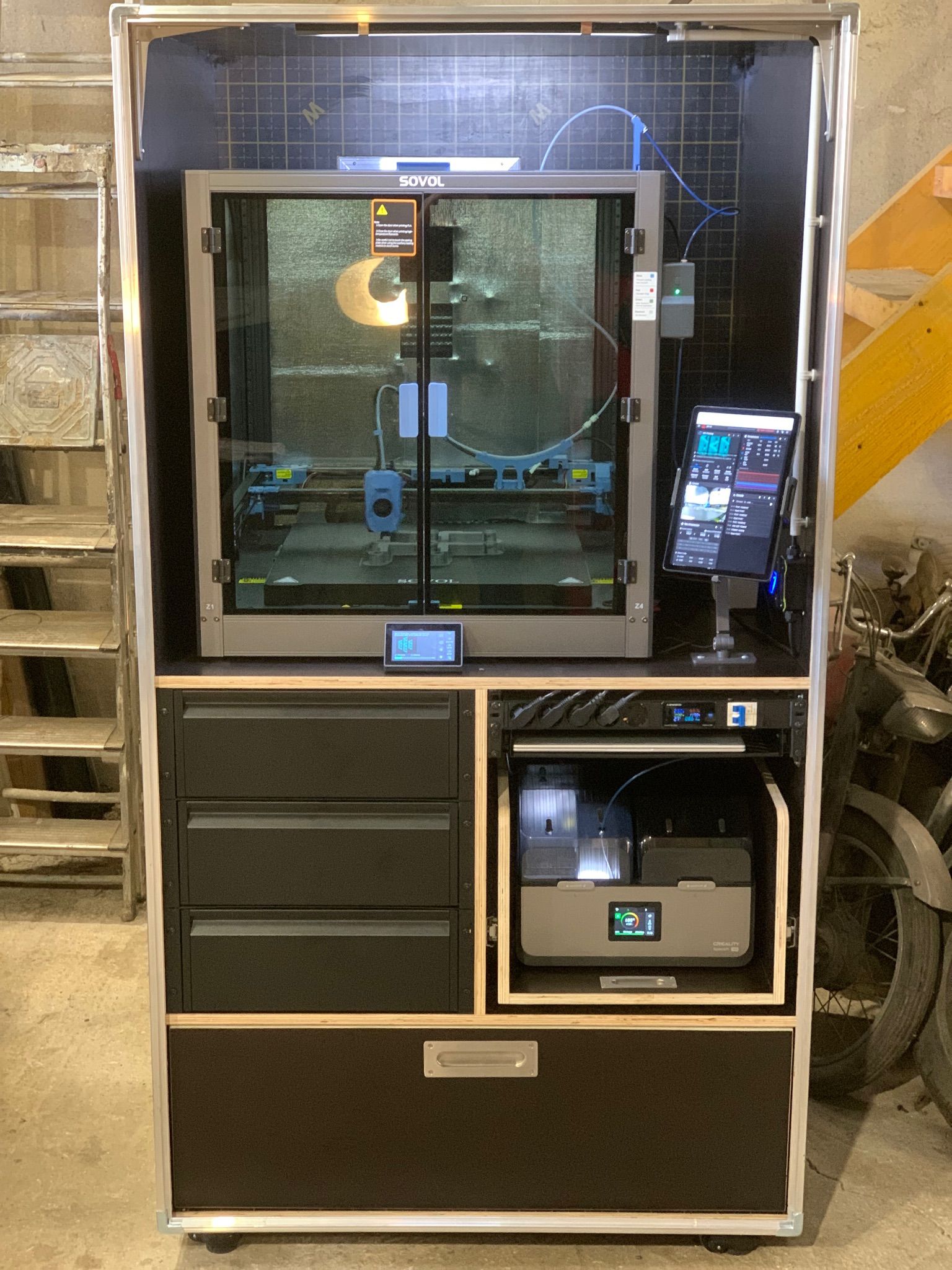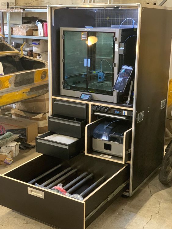 Bonjour à tous, Désolé, je ne vous ai pas donné de nouvelles car je n’ai jusqu’à aujourd’hui encore rien imprimer… je me suis occupé en priorité de terminer le montage de l’imprimante. Comme évoqué , j’ai isolé les parois avec un isolant thermique mince. J’ai aussi isolé le dessous du bed avec une laine de céramique. On ne s’en rend pas vraiment compte en photo mais une fois la chambre fermée, c’est un beau bébé ! Mon atelier est extrêmement poussiéreux y travaillant le bois, métal, peinture au pistolet et tout ce qui me passe sous la main , je me suis rendu compte en montant l’imprimante que c’est une machine de précision et que je ne pouvais pas la laisser prendre la poussière sans lui fabriquer un meuble digne de ce nom pour la protéger. Le temps d’y réfléchir, de réunir les éléments et de le fabriquer, ça m’a pris un peu de temps.. Comme j’avais besoin d’un meuble mobile et robuste, je me suis décidé pour la fabrication d’un meuble Flight-case. Pour en avoir déjà quelques-uns, je sais que c’est plutôt pratique en atelier. voici quelques photos. Le meuble fait environ 100x100x190cm. Je lui ai mis des roulettes de nivellement de ce type pour un maximum de stabilité. Un raccord p17 à l’arrière pour une rallonge secteur et une trappe pour la ventilation de l’imprimante. A l’intérieur, j’ai essayé d’aménager ça au mieux pour en faire une station de travail compacte et complète. En bas, une grand tiroir d’environ 100x100cm pour le rangement des filaments. Je l’ai siliconé au maximum pour le rendre étanche autant que possible.. Au dessus, trois tiroirs de rangement, à droite, un tiroir pour le dryer, une multiprise avec disjoncteur avec un petit compteur de conso trouvé sur AliExpress. J’aimais bien l’idée pour calculer la conso de chaque impression. Et juste eu dessous un tiroir plateau pour un PC. Et en haut , l’imprimante, il manque la rehausse que je dois imprimer… et un petit bras pour une tablette comme écran de contrôle de l’imprimante. Encore quelques petits détails a finir mais l’ensemble semble à peu près fonctionnel.. Ce milieu de semaine, j’ai donc enfin pu lancer les tests d’impression ABS. Ils concernent la rehausse de l’imprimante évoqué précédemment.. j’ai effectué deux premiers tests ratés pour un problème de warping je crois, les coins qui se soulèvent et se décollent du plateau. Le premier test dès la deuxième ou troisième couche. Le deuxième un peu plus tard dans l’impression, j’avais mis de la colle sur le plateau.. je suis parti du preset ABS Generic d’orcasliser qui me paraissait dans l’ensemble cohérent avec les infos que j’avais. Aujourd’hui j’ai effectué un certain nombre de modifications sur ce preset, avance plus lente de la couche initiale 20mm/s, couches moins épaisses 0,15mm, vitesse d’avance plus lente, chambre à 45°, bed plus chaud sur la couche initiale, etc.. j’ai lancé une impression cette après midi qui semblait mieux parti. on voit que les extrémités des pièces ne sont pas loin de se décoller avec le blanchissement des contours comme du plastique étiré . Ça tenait encore quand je suis parti, ce sera la surprise demain matin! je ne sais pas ce que je peux faire de plus? Par contre, les couches sont très visibles et je me demande d’où vient le problème. Ça ne me dérange pas particulièrement vu que j’aurai principalement des pièces techniques et non esthétique à réaliser mais si il y avait possibilité d’obtenir un meilleur rendu ce serait d’autant mieux.. j’ai lu que ça pouvait provenir de plusieurs facteurs comme une Température trop basse, Un Débit mal calibré, un Problème mécanique sur l’axe Z, un Refroidissement non contrôlé, une Vitesse excessive. J’ai du mail à me faire un avis. j’ai aussi lu que cette Sovol sv08 max manquait de précision dû à sa taille. Est-ce que ça pourrait être la cause?