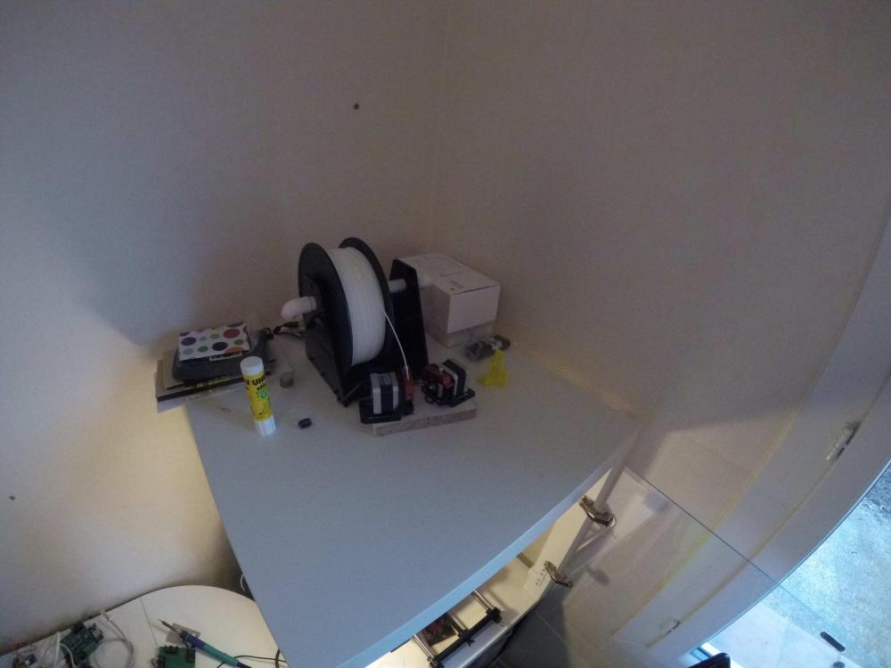 J'ai choisi d'utiliser trois tables Ikea pour avoir une hauteur suffisante. Les pieds d'une des tables ont été coupés pour pouvoir augmenter la zone dévolu à l'imprimante. J'ai placé 4 carrés de plexiglass (qu'est ce que c'est chère !) 50x50 sur chaque face et tout sur charnières :