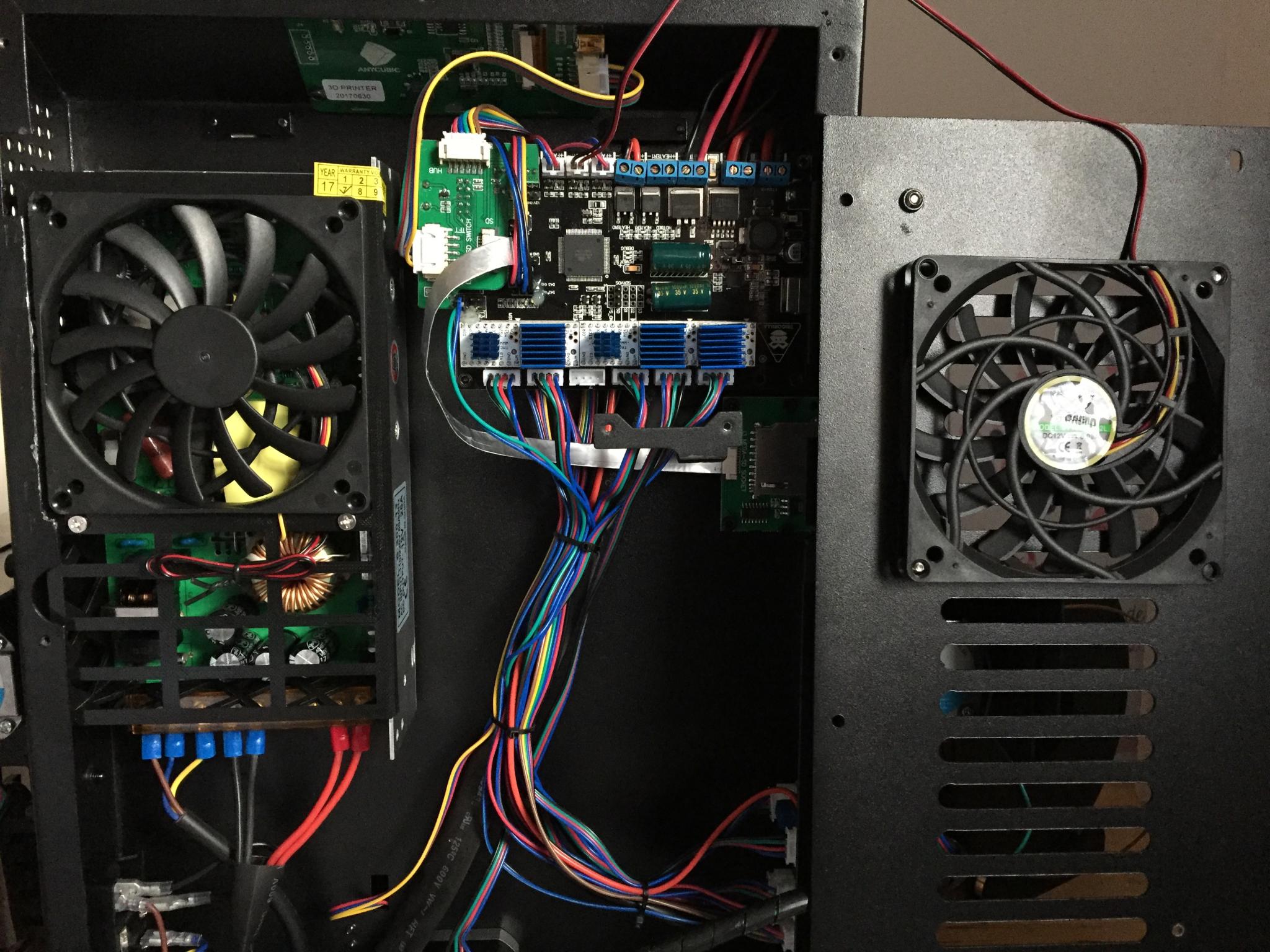 Re, Finalement je n'ai pas trouvé le changement de steppers révolutionnaire, j'ai enlevé les TMC2100 ainsi que les TL-smoothers pour installer sur les 5 emplacements des TMC2208 (21€ les 5 : https://fr.aliexpress.com/item/5-pcs-Super-Silencieux-TMC2208-V1-0-Stepstick-Stepper-Motor-Pilote-Module-Dissipateur-de-Chaleur-Pour/32838778073.html?spm=a2g0s.9042311.0.0.NXpDJk ). En revanche là on y est dans le révolutionnaire pour notre i3 : c'est vraiment du plug (set 1,06V), invert and print. il faut régler la Vref à 1,06V. Voici l'ordre des fils à respecter pour chaque stepper en photo. Comme la machine était ouverte, j'en ai profité pour monter le ventilateur scythe sur la plaque du dessous plutôt que sur la patte de fixation (merci @stef_ladefense pour l'idée). Et j'ai également imprimé le nouveau cache d'alim proposé par @Baroudeur (merci pour le partage, https://www.thingiverse.com/thing:2750806), y est installé un second ventilateur scythe (identique au précédent: https://www.amazon.fr/gp/product/B0017K8X4M/ref=oh_aui_detailpage_o01_s00?ie=UTF8&psc=1). Il démarre dès l'allumage de l'imprimante, pour éviter que la prise ne bouge j'y ai mis un point au pistolet à colle. En revanche pour que tout cela rentre j'ai dû couper sur 2 mm la rainure en métal du caisson : Voici le résultat final: Ainsi j'obtiens enfin un grand silence et des prints très propres. Le caisson est bien refroidi, rien à signaler après des prints très longs. Il ne restera plus qu'à terminer le chainage de l'axe Y quand @Murdock aura fini ce dernier.
