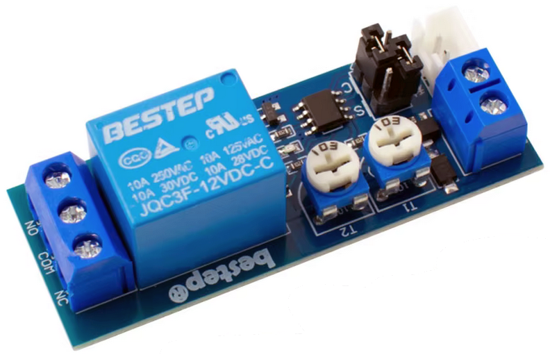 2. Bonjour, J'ai donc terminé et déjà utilisé mon montage grâce au schéma d'@Alain D. et ça fonctionne très bien. Il s'agit d'une machine de désembouage artisanale pour chauffage central par radiateurs ou plancher chauffant. Le montage utilise la carte ci-dessous pour régler la temporisation. Bien que la puissance de l'électrovanne 12 v soit ridicule, je me demande si le relais va tenir le choc avec une action toutes les 3 secondes ! Un relais comme ci-dessous est-il plus adapté et fiable que celui intégré à la carte ? Si oui, quel serait le sens du câblage pour souder les fils à la place du relais de la carte ? Merci