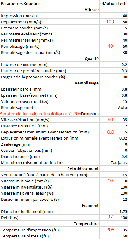 @Math51 Quelques conseils (rajoutés en rouge) à la lecture de tes paramètres Cura : Pour moi tu ne rétractes surtout pas assez vite, du coup ça bouche la buse. Par ailleurs vu ta vitesse d'impression (surtout pour le remplissage), ta température me parait un poil basse. -