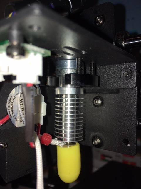 Bon ca y est mon Anycubic est libérée donc j'ai pu enfin installé la Hotend AiO Evo de hotend.fr, voici un petit Tuto: Donc, installation de la thermistance avec la pate thermique, mise en place du capuchon de protection en silicone: montage du ventilateur et adaptation des câblages pour notre Anycubic, vous noterai le système à aimant "MAGNET-FIT" pour installer le tube de PTFE à la hotend, cela me permet de compenser une partie de la différence de hauteur avec la hotend d'origine (environ 10mm de difference) Installation sur l'Anycubic, rien de bien compliqué, j'ai repris le système d'origine il y a un delta de 4mm que j'ai compensé en remontant le Bed, je ferai plus tard pour faire une piece en interface Modification de la thermistance dans le Marlin/Configuration.h: Choix de la thermistance " 1" : 100k thermistor - best choice for EPCOS 100k (4.7k pullup) puis uploader le firmware modifié dans l'Anycubic Reglage du PID en envoyant le G-Code: M303 S200 C8: on obtient les valeur Kp, Ki et Kd, qu'on modifie dans le Marlin/Configuration.h et c'est parti, petit cube de calibration, la monté en température est presque 2 fois plus rapide, j'ai plus mes problèmes de chute de température que j'avais avec la hotend d'origine, notamment quand le ventilateur se mettait en route à la 2e couche, il me reste à affiner les réglages, je vous ferai un retour après quelques temps d'utilisation. Merci à @Fourmi
