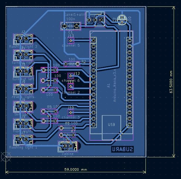 Bonjour, @electroremy @ELECTRONICIEN SENIOR j'ai besoin de votre aide pour réaliser un PCB pour un module électronique.(commande des feux éclairages véhicule RC) J'utilise KICAD pour dessiner des typons ou circuit électronique. mon module comporte un ARDUINO pour commander les différents éclairages d'un véhicule RC. Les leds phares, clignotants, feux stop et de recul etc...sont commandés via un récepteur radio 2.4Mhz. J'ai besoin de réalisé plusieurs circuits imprimés mais je suis bloqué pour communiquer avec les sociétés qui réalisent les gravures. La démarche technique est pour moi compliquée j'ai tous les fichiers PCB Schéma etc .mais je ne sais pas faire. ! je sais concevoir un schéma et la logique d'un circuit mais pour réaliser un PCB je suis nul. Mon besoin c'est de commander un PCB dans une entreprise spécialisée oui mais comment ??? Si vous êtes disponible pou m'aider je joints tous les fichiers. Mon prototype fonctionne très bien en maquette. a+ Francis subaru.kicad_cuivrepcb-2025-10-09_070618.zip -