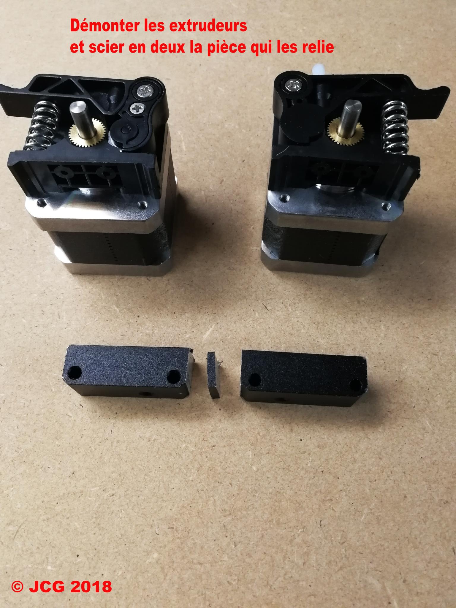 Bonjour à tous J'ai vite compris que deux extrudeurs embarqués, ça fait beaucoup d'inertie pour une petite structure comme ça. Je voulais surtout faire ça moi-même, pas pour une question d'argent mais pour une question de satisfaction. Alors voilà en images ce que j'ai fabriqué : Préparation de la tête double avec son radiateur : C'est fait avec >> de ça << Comme les tiges filetées ont un diamètre de 6 et les pneufits aussi, il faut les rejoindre par des écrous hauts >> comme celui-ci << Il sont trop hauts, je les ai sciés en deux. Certains l'auront déjà compris : la plus grande difficulté que j'ai eue, ça a été de percer des trous de 4 dans de la tige filetée de 6... Autre "détail", pour que les extrudeurs puissent se positionner comme je l'ai fait, il faut inverser leur sens de rotation Merci @hidius pour m'avoir trouvé dans le Marlin l'endroit à modifier. J'ai fait quelques essais, voir ci-dessous ma prochaine modif : Le comportement de la machine a changé du tout au tout..... Si certains veulent se lancer, je suis à leur disposition pour plus amples informations. Merci de votre attention !