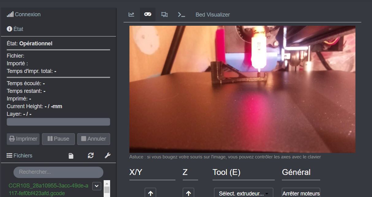 Bonjour, Je possède une cr-10 v2 avec octoprint et une pi cam v2.1.. Seulement voilà, je trouve la qualité pas terrible (voir screenshot) alors que la luminosité est plutôt bonne (bande leds dans l'encadrement Z de l'imprimante), disons que je trouve que ça manque vraiment de details et de clarté... L'idéal serait de la rapprocher mais malheureusement c'est impossible et je n'ai pas vraiment trouvé de solution pour l'accrocher au boitier du hot end... Je suppose qu'il n'y a aucune solution logicielle pour améliorer la qualité ? Sinon, pensez vous qu'une webcam comme la logitech c270 pourrait augmenter la qualité? Merci (Désolé si c'est pas le bon forum)