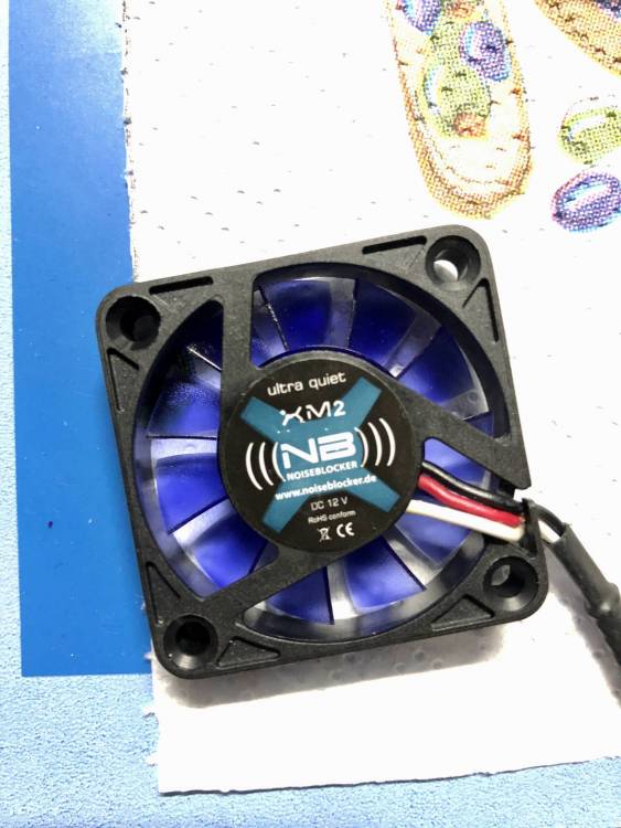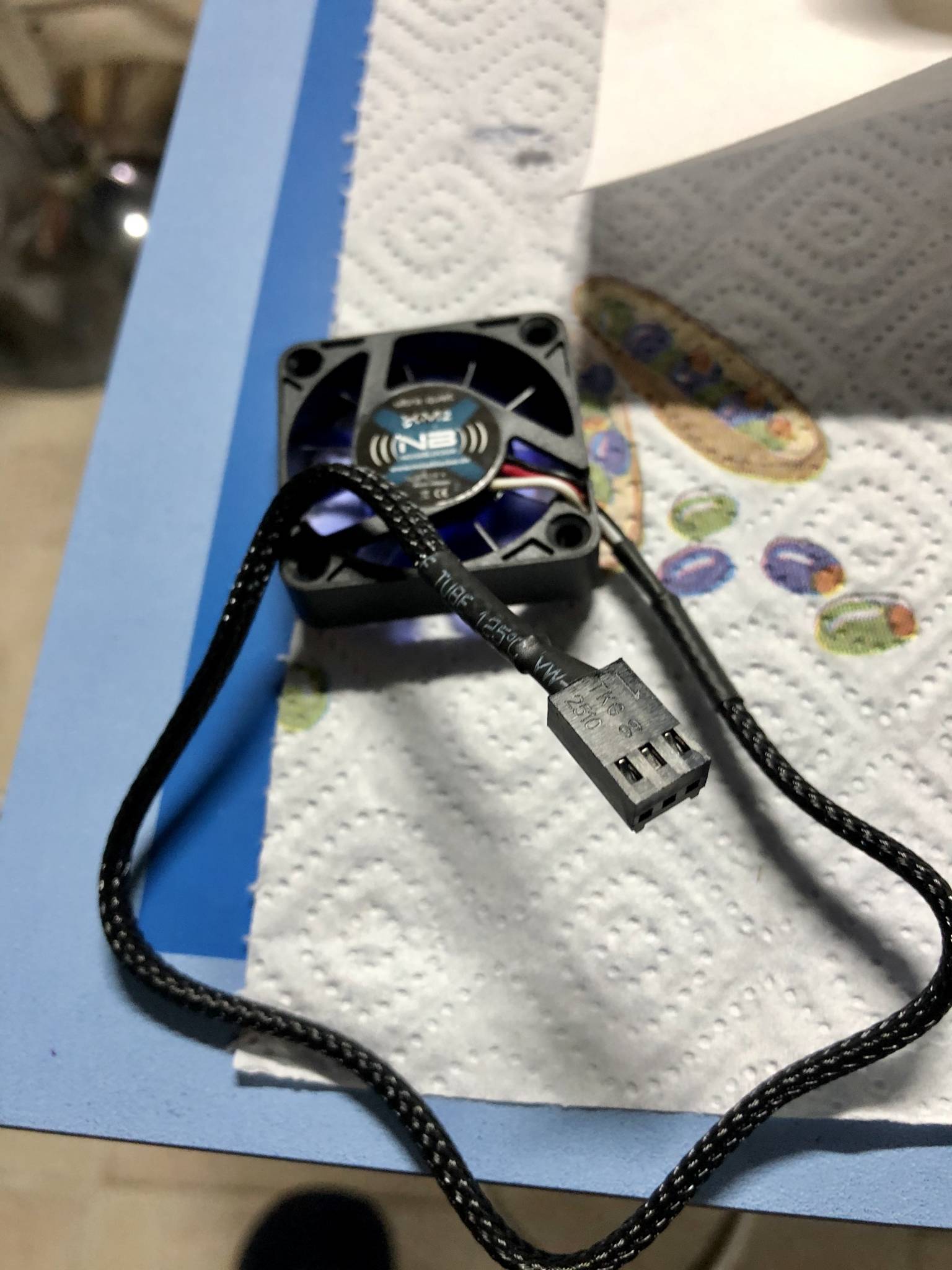 Bonjour. ne désirant pas entendre en permanence le bruit du ventilateur chargé de refroidir l'arrivée du fil dans la buse, j'ai ajouté un petit peu d'électronique. De ce fait, le ventilateur ne se met en marche que lorsque la résistance chauffant la buse est alimentée. (faire appel à un électronicien est nécessaire) Composants: - 1 diode, 2 résistances, 1 condensateur et 1 MOSFET de type N supportant au minimum 1A. Il n'y a pas de PCB prévu pour si peu. - 2 connecteurs compatibles avec ceux concernant le ventilateur La commande du MOSFET, c'est 1 fil vert soudé sur la polarité gauche de R43. L'alimentation du MOSFET provient du connecteur FAN2. J'ai placé les composants dans un petit boitier imprimé en 3D, pour lequel j'ai prévu l'insertion du connecteur allant vers le connecteur mâle du ventilateur. -
