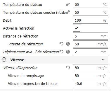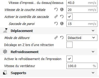 Bonjour tout le monde! J'ai besoin de vos lumières et de votre expérience pour optimiser mon temps d'impression et résoudre mes problèmes de remplissage. Je vous donne un peu de contexte : - ça fais 6 mois que je suis dans l'impression 3D donc novice. - imprimante Creality ender 5 flashée avec marlin 1.1.bug fix pour un bltouch v3. J'utilise Cura pour slicer et sous Catia pour modéliser. - je me suis lancé à faire un carter de protection à l'imprimante avec insonorisation, éclairage et ventilation. Le but est de réaliser entièrement le carter avec l'imprimante (oui je sais je me complique la vie mais sinon ce serai trop simple). Bon j'ai fais le carter sous Catia, et j'ai acheté tout s'qui faut. Y'a plus qu'a! Le carter sera entièrement en PLA avec une épaisseur de 4mm et de la forme (oui on se complique... mais c'est pour que madame trouve ça jolie dans le salon.. j'ai pas d'autre place ) Et voici la partie porte découpée pour être imprimer. Pour l'instant, ma technique d'assemblage de chaque plaque consisterai à faire une coque suffisamment grande pour faire des chanfreins et souder avec un stylo 3D puis poncer. Le carter sera ensuite peint à la bombe en noir et blanc. Si vous avez d'autres idées ou expériences, je suis preneur! Donc pour les paramètres, j'ai opté pour une buse de 0.8 et une hauteur de couche de 0.4 pour diminuer le temps au vu des nombreuses impressions que je vais devoir faire. J'utilise deux PLA différents : un PLA+ SUNLU et un PLA 3D Warhorse. Je cherche à optimiser mes paramètres surtout pour diminuer le temps d'impression ; une tenue mécanique sans plus (j'ai pas de contrainte dessus), ni trop de contraintes sur la qualité (juste suffisamment pour l'assemblage et pour que je puisse corriger les défauts en ponçant et finir à la bombe) Voici les paramètres: J'ai, de plus, un problème que je n'arrive pas à résoudre depuis le début. C'est sur le remplissage. Les lignes de remplissages se croisent et font des surplus de matière qui entrent en collision avec la buse ou fait trembler le plateau et ça finit par donner ça : Est-ce que c'est possible de gérer le débit de remplissage seulement, je trouve pas ce paramètre dans cura. J'ai essayé pas mal de choses mais je trouve pas de solution sur ce coup.. Voila, j'ai essayé de vous donner pas mal de détails donc déjà merci si vous avez pris le temps de lire et je suis tout ouïe! Bonne soirée à vous tous ! A+
