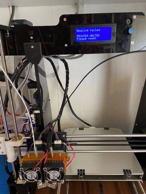 ... Définition de la frustration : Bonjour a tous, ... en espérant que vous puissiez m'aider. Après m’être fait la main sur une anet A8, je suis passé sur une anet A8-m (double extrusion) ... et là, les problèmes ont commencé. Au bout de 5 mois, j'ai eu un problème pour régler les buse a la meme hauteur ... ce qui s'est fini, à force de réglages, par metre la pièce commune au 2 extrudeurs HS. ... pièce qu'il est impossible de trouver sur la toile. Au final, J'ai été obligé de changer le système d'extrusion "Haomingxing MK8 Extrudeur" photo 1. Depuis, je n'ai que des erreurs soit "heating failed" ou "Thermal runaway" ... et ceci, apres avoir verifié une 10zaine de fois mes câblages. Ce que je ne comprends pas, c'est lors de la montée en T° avec un "preset PLA" les 2 extrudeuses montent bien a 210° et le plateau chauffant a 62°. Par contre si je lance l'impression, je n'arrive même pas a finir ma première couche d'une pièce de 4cm/4cm. Donc en résumé, .... help !!