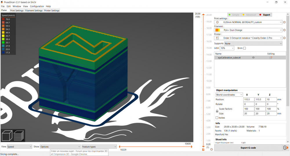 Bonjour à tous, Suite à quelques défauts d'extrusion sur un cube de calibration qui semblaient être assez "organisés" pour que cela vienne du slicer, j'ai voulu regarder à quoi correspondaient ces défauts. Les couches extrudées différemment coïncident avec des changements de vitesse de buse sur les périmètres extérieurs. Sur la plupart des pièces que je slice il y a tout le temps des changements de la vitesse d'impression qui correspondent à des changement de forme (les lettres du cube de calibration par exemple) je pensais donc ces changement de vitesse normaux. Or, lors du visionnage d'un vidéo de la chaine YouTube Teaching Tech, j'ai remarqué sur son slicer que la vitesse d'impression de son cube de calibration était homogène sur la hauteur de l'impression. De plus la vitesse maximal rentré dans mes paramètre de slicing n'est jamais atteinte selon mon slicer alors que mon accélération devrait être suffisante (1000mm/s^2) Je souhaiterais savoir si il est possible "d'homogénéiser" mes vitesses d'impression. J'utilise PrusaSlicer et voici une capture d'écran d'un cube slicé où vous pourrez voir les différences de vitesse. PS : J'ai aussi mis ma config PrusaSlicer Merci d'avance à ceux qui me répondront PrusaSlicer_config_bundle.ini