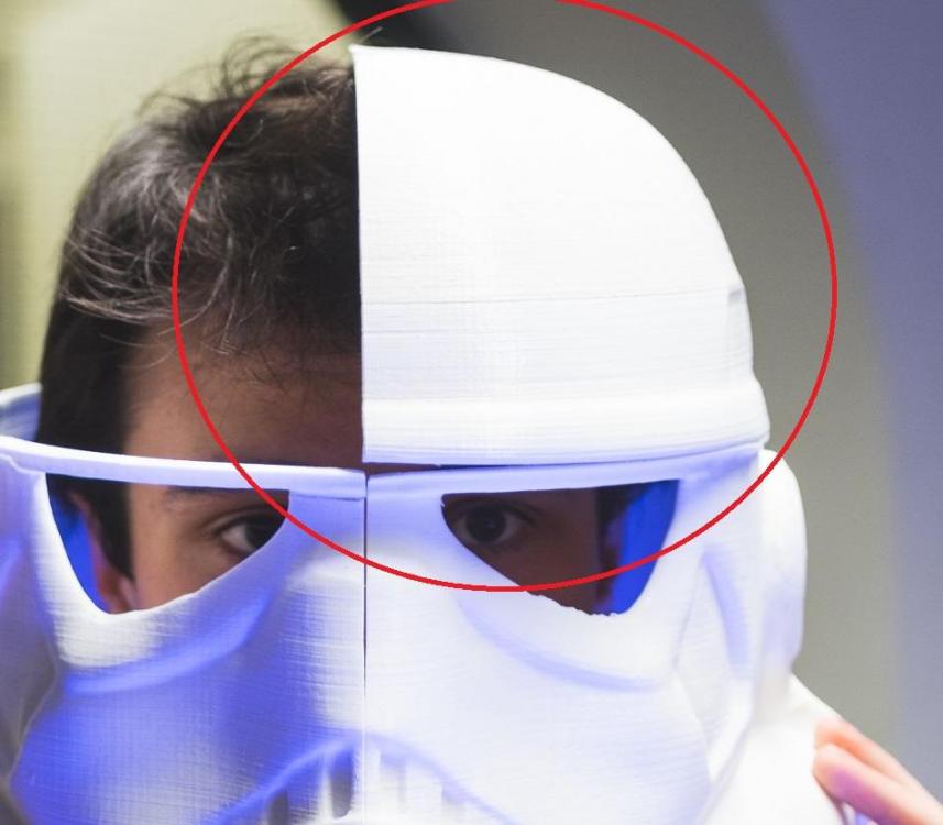 bonjour à tous et à toutes!B Je viens vers vous car je rencontre un petit soucis d'impression sur une pièce que je n'ai pas affronté par le passé! Il s'agit d'imprimer la pièce entouré sur l'image ci-dessous : C'est la première partie haute du casque d'un Stormtrooper! Alors je n'ai pas de screens de mes paramètres à vous joindre pour l'instant (peut-être ce soir). Mais mon soucis est le suivant : Arrivé à bonne hauteur, au moment où le haut du casque commence a être très curviligne. L'impression est tombé (décollé du plateau). Je pense que la surface au sol est très petite et a fait tombé la pièce. Ma question est donc, comment imprimeriez-vous cette pièce? - Rapide/Lent? --> J'ai personnellement mis plutôt rapide. - Un brim/skurt important? Au vue de la faible surface au sol, je ne suis même pas sur qu'un brim/skirt important fasse l'affaire? - Des supports? recouper? J'attend vos retours et suggestions avec impatiences! En vous remerciant, Mehdmehd,