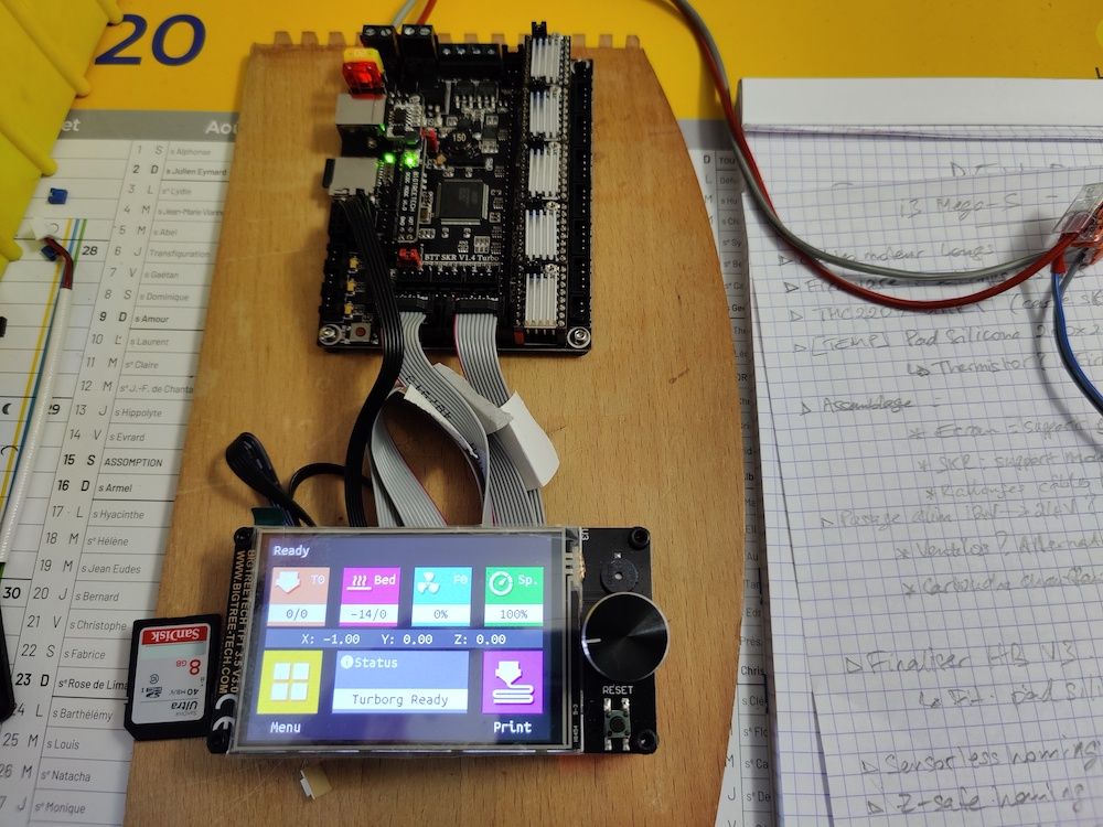 Allez, je me lance ! J'espère penser à alimenter ce topic. C'est un des projets du moment dans mon modeste atelier (avec la conception d'un automate pour mon groupe *) : passer ma i3M-S en version "sous stéroïdes". De la même façon que les consoles ont évolué au fur et à mesure des générations, passant d'une archi 8-bits vers une archi en 16 puis 32-bits jusqu'aux monstres actuels, chaque nouvelle génération surpassant la précédente, les imprimantes 3D évoluent aussi. Et vu que les cartes 32-bits sont abordables pour la plupart, pourquoi s'en priver ? La base actuelle est la suivante : Trigorilla 1.1 + TMC2208 (non UART) BL-Touch Plateau en alu de 3mm d'épaisseur + heater en silicone (220V / 500W), plaque d'impression magnétique double face en acier ressort enduit de PEI (lisse et texturé) Rails linéaires sur l'axe Y (les guides originaux ont fini par ployer) Marlin 2.0.7.2 (customisé maison) Bonus : heatbreak all-metal sur la tête d'impression d'origine (j'ai la flemme de passer sur une V6 pour le moment). J'ai le lien dans un coin au cas où vous seriez intéressés ou simplement curieux. ^^ Pas vraiment "stock" (seul l'essentiel a été indiqué). Mais elle fonctionne très bien, voire mieux qu'à l'origine. Donc... passons au vif du sujet. C'est encore un WIP (Work In Progress), toutes les problématiques n'ont pas encore été solutionnées. Niveau hardware, j'ai choisi de partir sur une SKR 1.4 Turbo ainsi que des TMC2209 en UART, ainsi que de virer absolument TOUTES les cartes additionnelles attachées à la Trigorilla actuelle. Je n'ai jamais vraiment compris l'intérêt de ces add-in boards. Pour moi, ça complique de manière inutile l'imprimante, notamment la maintenance. Il en va de même pour l'add-in board présente sur le bloc d'impression, qui a rendu l'ajout d'une BL-Touch assez ... touchy. J'ai pas mal galéré pour souder ces deux foutus fils d'alimentation sur les bonnes broches de cette carte additionnelle. Du coup, le tout est sécurisé avec de la colle chaude en plus des soudures. Toutes ces cartes seront, in fine, retirées et ne seront pas réutilisées sur la SKR. Ce sera du point-à-point, à l'ancienne, bien qu'un connecteur Molex Microfit en 3x2 soit prévu au niveau du bloc d'impression (pour switcher facilement entre différentes hotends, à terme). Des câbles plus sont pour les moteurs sont déjà en stock, il restera des câbles à préparer pour le reste (sauf les 3 fils "servo" de la BL-Touch : j'ai déjà intégré ça avec un Mini-XLR sur le côté droit du châssis). L'écran TFT d'origine ne fera pas non plus partie des choses conservées. Le tactile, c'est bien, mais une interface plus "simple" est parfois mieux. Le TFT35 V3 de BigTreeTech réunissant le meilleur des deux mondes, BINGO. Niveau alimentation, je ne sais pas si l'actuelle (une 350W) sera conservée ou si une autre sera acquise. Le lit chauffant fonctionnant sur 220V (avec SSR, bien sûr), l'alimentation 12V n'a plus à fournir les 11A que l'ancien système demandait. Ça fait donc 11A de gagnés, donc peut-être qu'une 15A suffirait. Je ne sais pas... De même, j'ignore encore si, à terme, l'imprimante passera en 24V. Ce serait préférable sur certains aspects, mais pose d'autres questions (notamment les ventilateurs. La cartouche chauffante n'est pas un souci, la solution est immédiate). A voir ... NIveau software, j'ai repris la base du Marlin 2.0.7.2 que j'avais adapté pour la Trigorilla, et l'ai adapté à la SKR. Le temps du développement/bricolage, la SKR et le TFT35 ont été (et sont toujours) surélevés via des entretoises en nylon et vissés sur une plaque de bois (la "Dev Board"), le tout alimenté (pour tester le montage hors impression) via un transfo 12V/10A qui sert normalement pour l'automate. A l'heure actuelle, la base du firmware est faite. La config est super simple, je passe par PlatformIO pour débloquer les features voulues et spécifiques sur cet ensemble hadware affectueusement nommé... Turborg (combinaison de Turbo et Borg/Cyborg). Résumé des trucs : Adaptation du firmware à la SKR + TF35 : fait TMC2209 UART : fait Intégration de la SKR dans le châssis : à faire. J'ai quelques pistes, sûrement 2 petites pièces à imprimer en PETG. Intégration du TFT dans le châssis : à faire. Je ne sais pas encore si la Dremel sera de sortie pour ajuster la découpe, ou si un adaptateur sera utilisé pour clipser le tout dans la découpe d'origine ... Câblage général : à faire Passage en 24V : ? Alimentation plus "light" : ? Si vous avez des remarques, questions, suggestions, go ! * à aborder éventuellement sur un autre topic, si c'est ok ?