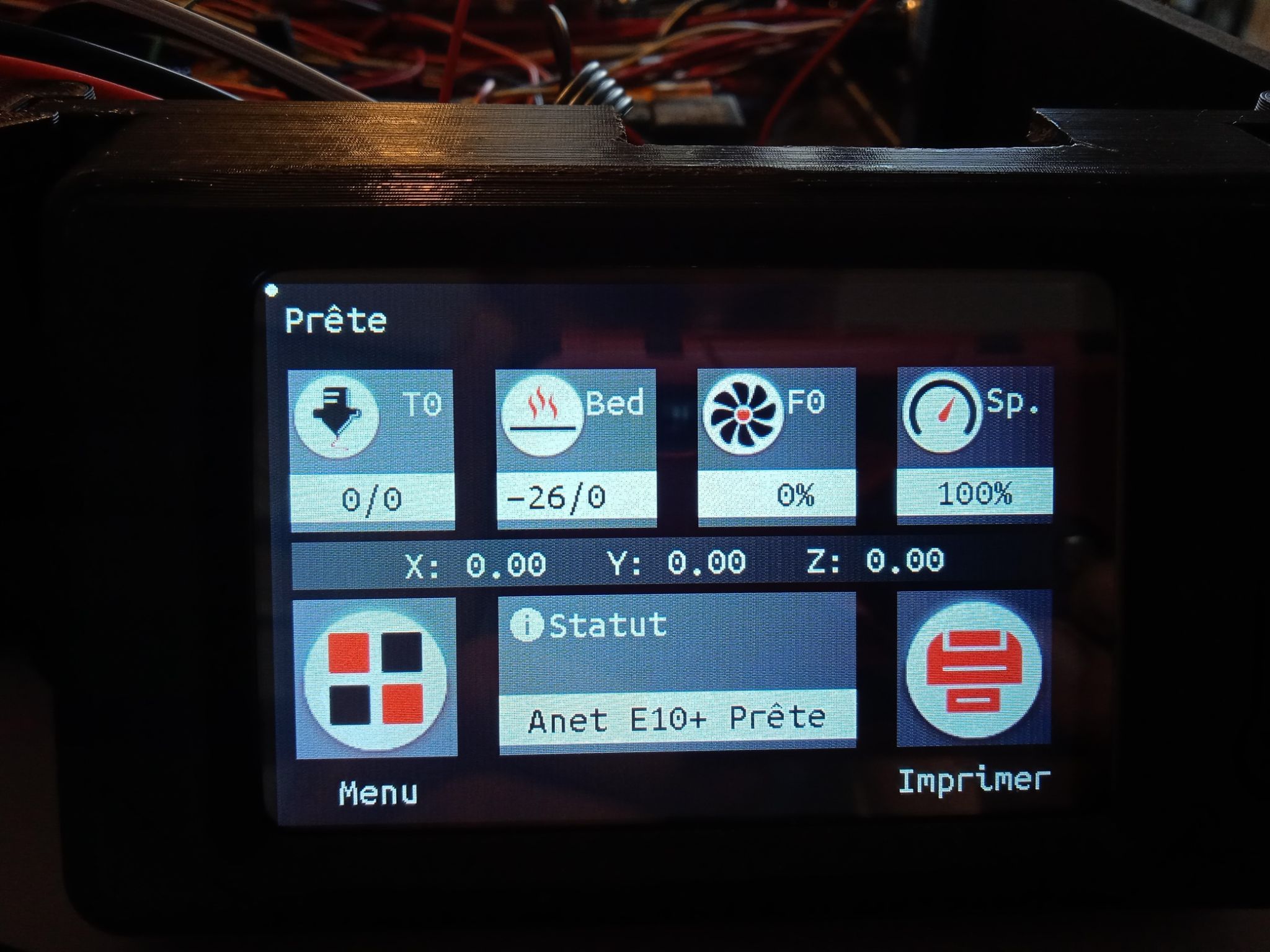 installation de l'écran Mks TFT35: Vous devez bien choisir la dimension de l'écran. le 3.5 pouce et un peu trop grand pour être mis en bas. si vous devez le mettre en haut, il faut des câbles plus long. le 3.2 ou 2.8" pourront être montés en bas à la place prévu avec les câbles d'origine (à modifier!!) Makerbase TFT 32 ebay Mks TFT35 Câble 8pin idc ou câble 2pin jst xh env. 90 Cm pistolet à colle il faut bien repérer les bornes sur l'écran TFT puis coté "Smoothieboard" émotiontech: ATTENTION: Vérifier 5 fois avant de mettre en marche ... je me suis trompé dans les couleurs chez moi Si vous envoyer du 5 volt sur la ligne DATA... Donc faite 2 fois attention Mise en service Pour la mise à jour et les réglages, c'est très simple! L'écran fonctionne sur le même principe que Smoothie. Il suffit de copier les fichiers sur la carte SD et de démarrer l'écran. mksTFT35.zip C'est très LONG. boire un L'écran va copier tous les fichiers et surtout toutes les icones (ici pour 3.5) Puis éteindre et redémarrer l'imprimante. et là C'est la fête! une nouvelle imprimante! Vous pourrez découvrir les joies: du "Babystep" Réglage à la volet de la hauteur d'impression De la "VRAI" pause en cours d'impression Ajustement de la température à la volée (attention bug double extrusion) Ajustement de la vitesse d'extrusion (adieu la sous extrusion parce que l'on change de filament) Libérer des pins Etc... Le thème des icônes a été crées par : https://github.com/DenisShelema/MKS-TFT3.5-light-and-dark-themes