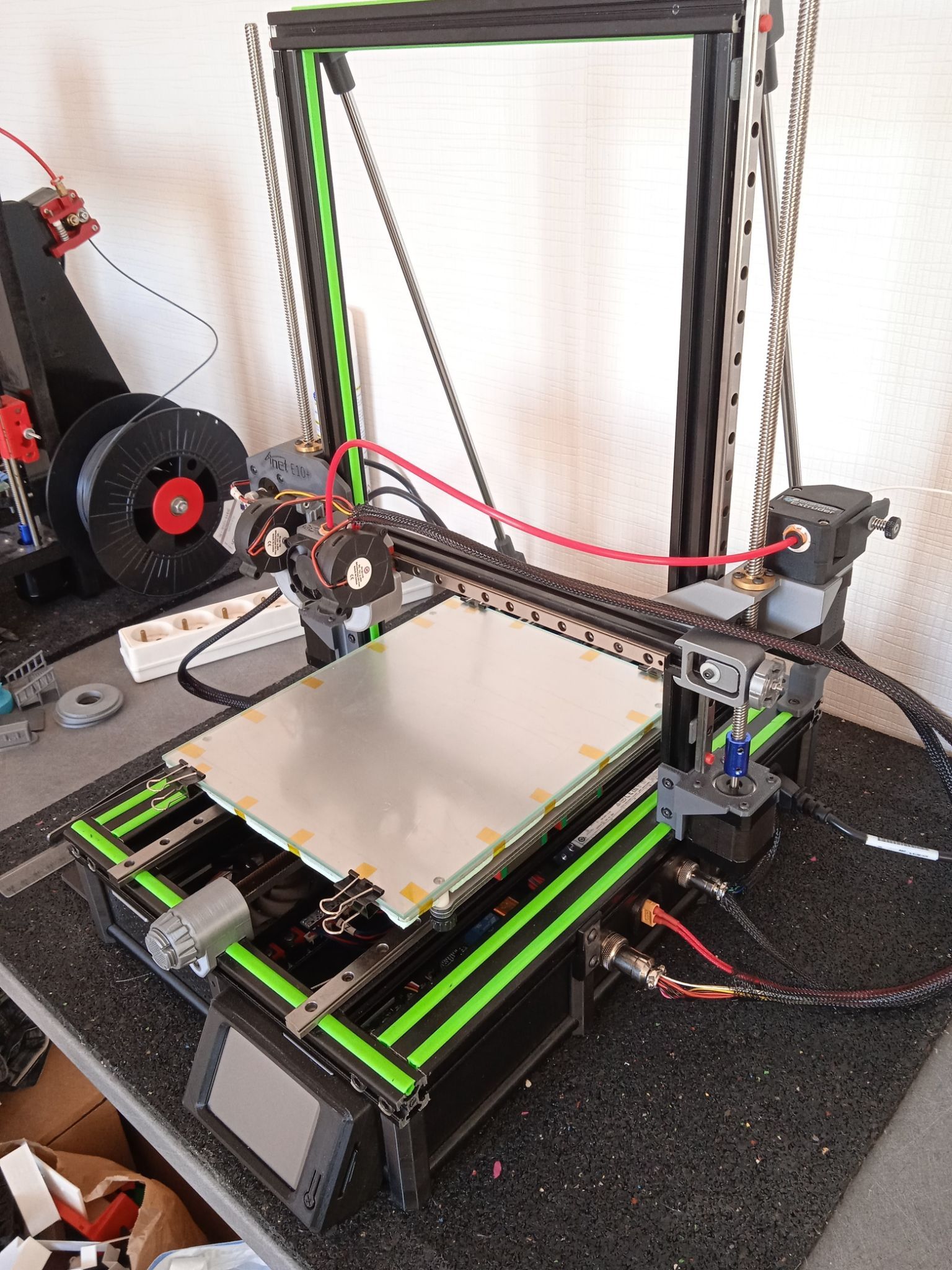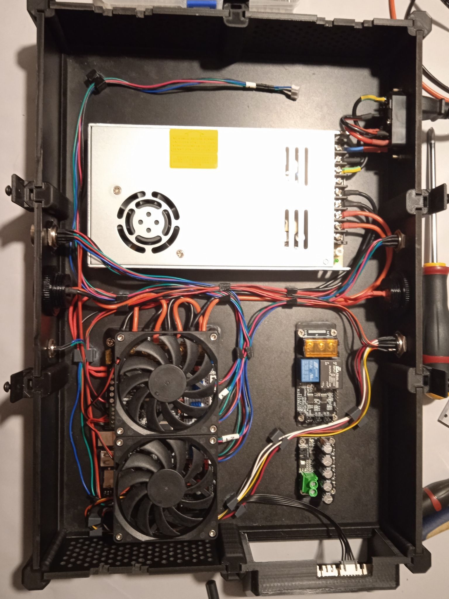 Bonjour à tous, Je suis en train de finaliser la construction de ma seconde imprimante. Je suis partie sur une base d'Anet E10 que j'ai upgradée. J'ai aussi fabriqué un fond à l'imprimante afin de la passer en mode standalone, que je trouve quand même bien plus pratique. Afin de faciliter la maintenance de l'imprimante, la partie mécanique et électronique se sépare facilement et rapidement. La partie mécanique est terminée, j'en suis à la partie électronique. Au niveau de l'électronique, j'ai une SKR Pro V1.1 pour gérer le tout. A ça, j'ai rajouté une carte BTT Relay V1.2 et une Mini UPS V2.0. Pour gérer le tout, j'ai pris un écran BTT TFT35 V2.0 (j'ai d'ailleurs eu du mal à le mettre à jour, il a fallu que j'upgrade le bootloader avant de réussir à faire quoique ce soit avec). Mais il y a des choses que je ne comprends pas et/ou que je n'arrive pas à régler quand tout est ensemble. Premièrement, la carte BTT Relay V1.2 à une fonction de détection de court circuit. Pour utiliser cette dernière, il lui faut un signal en 5V, signal que j'ai pris sur la carte mère. Or, quand tout est branché, je n'ai aucun 5V sur la CM et donc ça coupe l'alimentation de l'imprimante... Par contre, si je débranche la fonction de détection, aucun soucis, tout s'alimente correctement (3.3, 5 et 12v). Est ce que j'ai loupé un truc ? Je précise que j'ai paramétré le firmware en conséquence. Deuxièmement, toujours avec la carte BTT Relay V1.2, quand tout est alimenté correctement, je n'ai plus moyen de couper le courant à l'interrupteur général, il reste toujours alimenté (voyant allumé en permanence et quoique je fasse, je peux mettre l'interrupteur dans toutes les positions, ça ne coupe rien)... Le seul moyen de couper l'imprimante est via le TFT. Il faut ensuite que je relance l'imprimante en réamorçant via la connectique spécifique de la carte... En faite, dès que je branche l'imprimante, tout s'alimente d'office, que l'interrupteur soit sur ON ou OFF... Il est normalement branché correctement. D'ailleurs, si je supprime la carte Relay de l'équation, tout fonctionne normalement. Il y a donc bien un truc que je n'arrive pas à comprendre mais quoi ? Troisièmement, j'ai un soucis avec la carte Mini UPS V2.0. Quand elle est connectée au reste de l'imprimante, au démarrage, c'est comme si elle pompait tout le jus. En tout cas, le reste de l'imprimante n'a pas le temps de s'alimenter et au bout d'un petit délai (quelques secondes), la carte BTT Relay V1.2 ne recevant aucun signal de la part de la CM coupe l'alimentation et ça éteint donc toute l'imprimante. Voila, j'ai donc besoin d'un peu d'aide pour réussir à finaliser tout ça. Je ne pense pas que ce soit grand chose. C'est peut être juste moi qui ne comprend pas comment fonctionnent ces cartes. Je joins quelques photos du montage pour illustrer tout ça. Ne vous fiez pas au câblage bordélique, c'est temporaire le temps de tout paramétrer. Une fois que tout fonctionnera correctement, tout sera mis au propre. Merci d'avance, Bonnes impressions à tous.