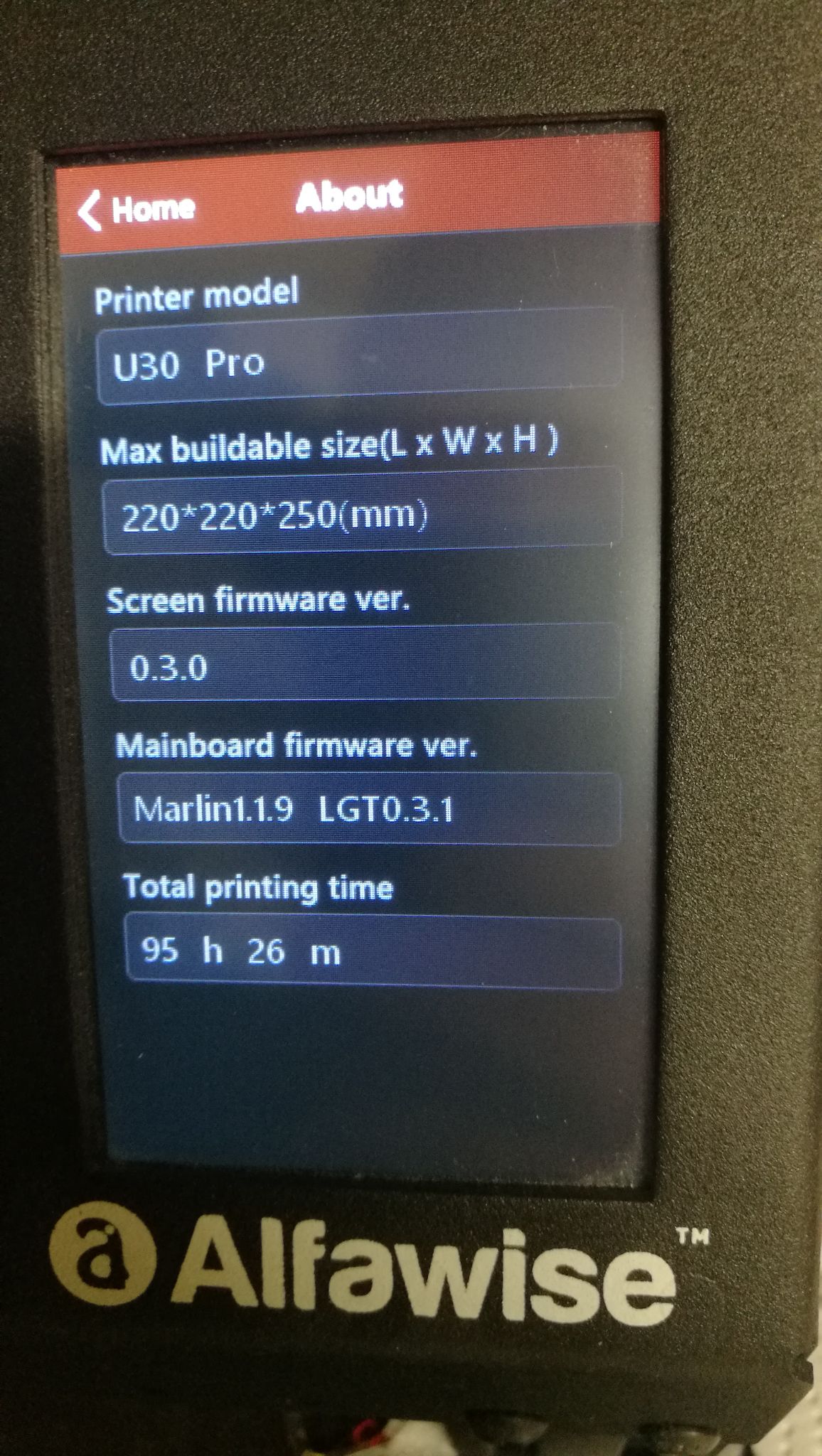 Bonjour à tous, Fraichement inscrit sur le forum car je rencontre un (nouveau) problème sur mon Alfawise U30 Pro, je viens donc vers vous pour de l'aide et une résolution éventuelle. Symptômes : Impossible d'imprimer / de démarrer une impression... (c'est simple ) Elle s'allume parfaitement, je peux faire chauffer le lit, la buse. Je peux utiliser absolument toutes les commandes (leveling, mouvement simple, Home, Filament change, extrusion,...) mais lorsque je vais dans l'onglet Print -> Files, je n'ai rien qui s’affiche (plusieurs carte utilisée, plusieurs fichier utilisée dont certains que j'ai utilisée précédemment avec succès, carte formatée, etc...) J'ai donc essayé de la branché en USB et utiliser Cura pour la première fois, l'imprimante est reconnu, et je peux sélectionner "Print via USB" Cura lance l'impression, indique "Impression en cours" mais la machine ne bouge pas, ne chauffe pas, n'indique rien... Je pense donc que si vous n'avez pas d'idée précise du problème un flash de la carte serait surement utile. Néanmoins je souhaite savoir comme le faire et où trouver le Firmware (je sais que je peux le trouver sur internet mais j'ai peur de prendre le mauvais...) Infos supplémentaire : Je ne vois aucune endroit brulée ou autre sur la carte, les ventilateurs marche très bien, l’écran aussi. Je n'ai pas testé le lecteur de carte au multimètre mais je ne vois pas comment il aurait pu se casser/dessouder d'un coup. LED D3 rouge et D4 bleu allumée lorsque usb branché. Mainboard Firmware Version : Marlin1.1.9 LGT0.3.1 Screen Firmware : 0.3.0 Je fournis deux photos même si elles sont mal prises et vraisemblablement inutiles Merci d'avance pour vos réponses Louloume -