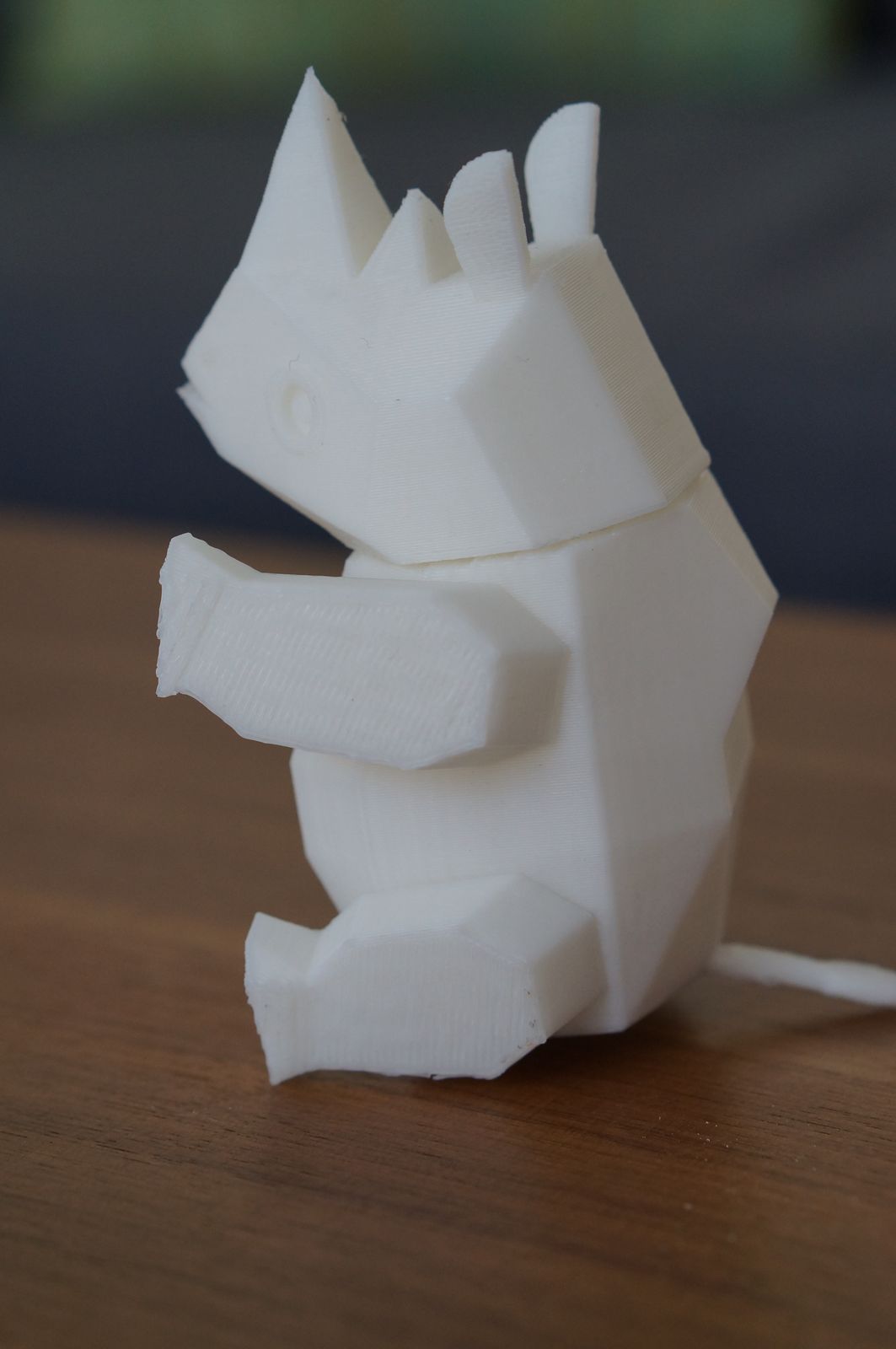 Plusieurs impressions successives dont un boudha dark vador (200 microns), un ours (200 microns), une vis+écrou moltonné (200 microns) et un support de brosse à dent en tête de T-rex (300 microns) malheureusement j'étais en fin de bobine donc ce n'est pas complet =).