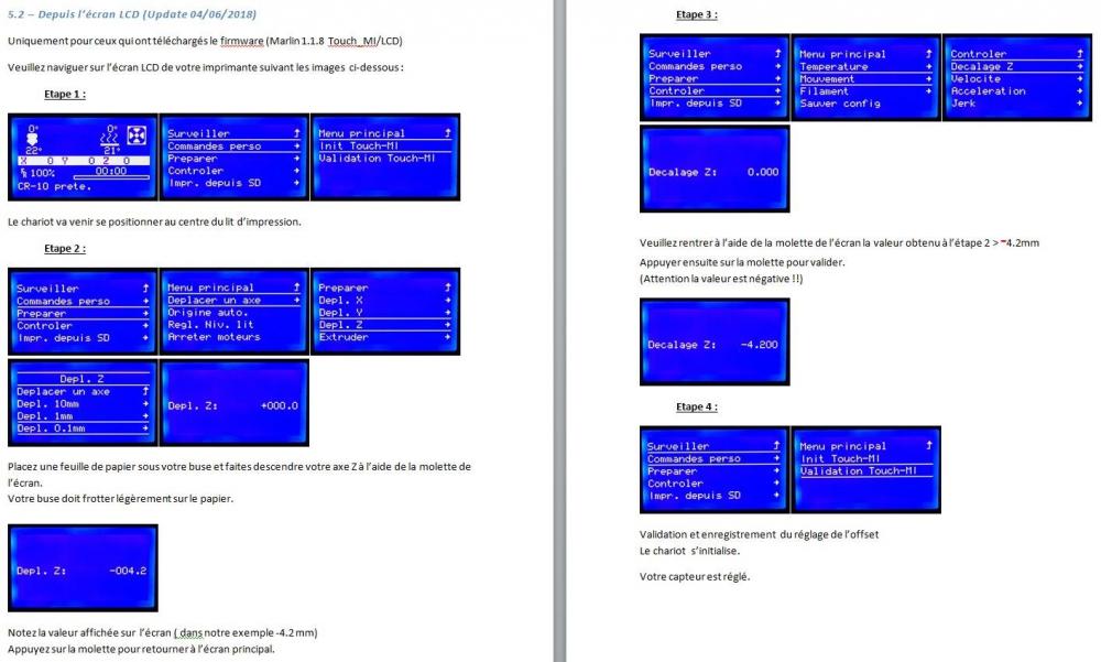 Fourmi Posté(e) Juin 18, 2018 Auteur Posté(e) Juin 18, 2018 Mise a jour du firmware marlin 1.1.8 ( Pour la CR10 & Cr10S), dorénavant vous pouvez régler le capteur depuis l'ecran LCD. les liens de téléchargements des firmwares sont dispos dans la documentation ( https://drive.google.com/file/d/1zAGvagyjzEX3QtdQGDpWTvXLcYBuwUqO/view) En images ....