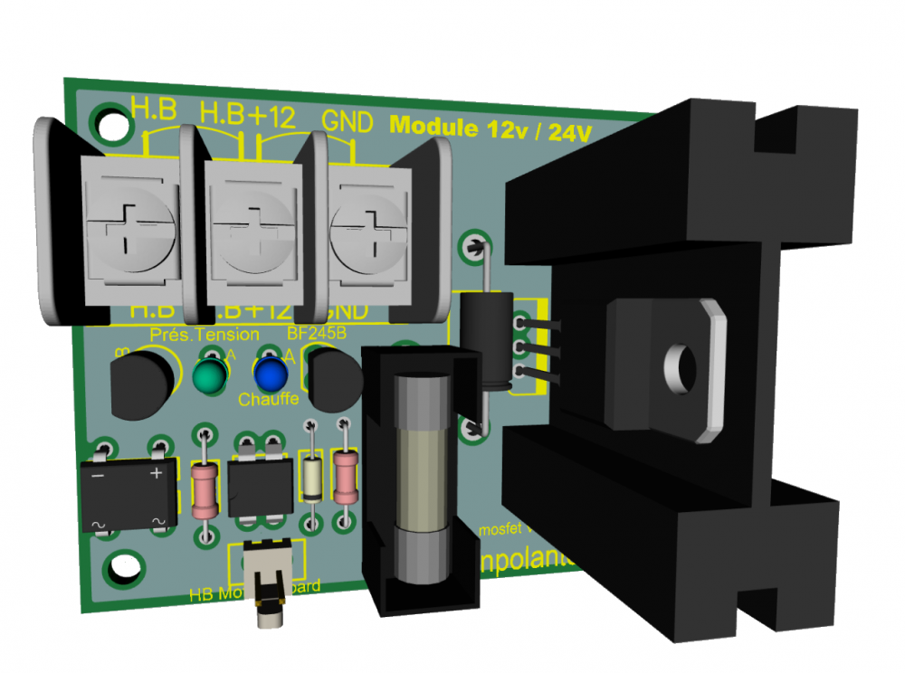 Janpolanton Posté(e) Juin 2, 2018 Posté(e) Juin 2, 2018 (modifié) Bonjour à tous, J'arrive à la fin des kits modules mosfet disponibles car il ne m'en reste qu'un seul. J'ai étudié une nouvelle platine V1.5 qui fonctionnera aussi bien en 12V qu'en 24V. Les dimensions n'ont pas changé et sont compatibles avec la plupart des supports disponibles sur thingiverse. Je lancerai très prochainement une première série de 10 ou 20 modules et je pourrai proposer les kits complets. Le prix n'est pas définitivement fixé mais tournera probablement autour de 8€ Ci-dessous, une vue 3D de ce futur module. Modifié (le) Décembre 22, 2018 par gisclace 1